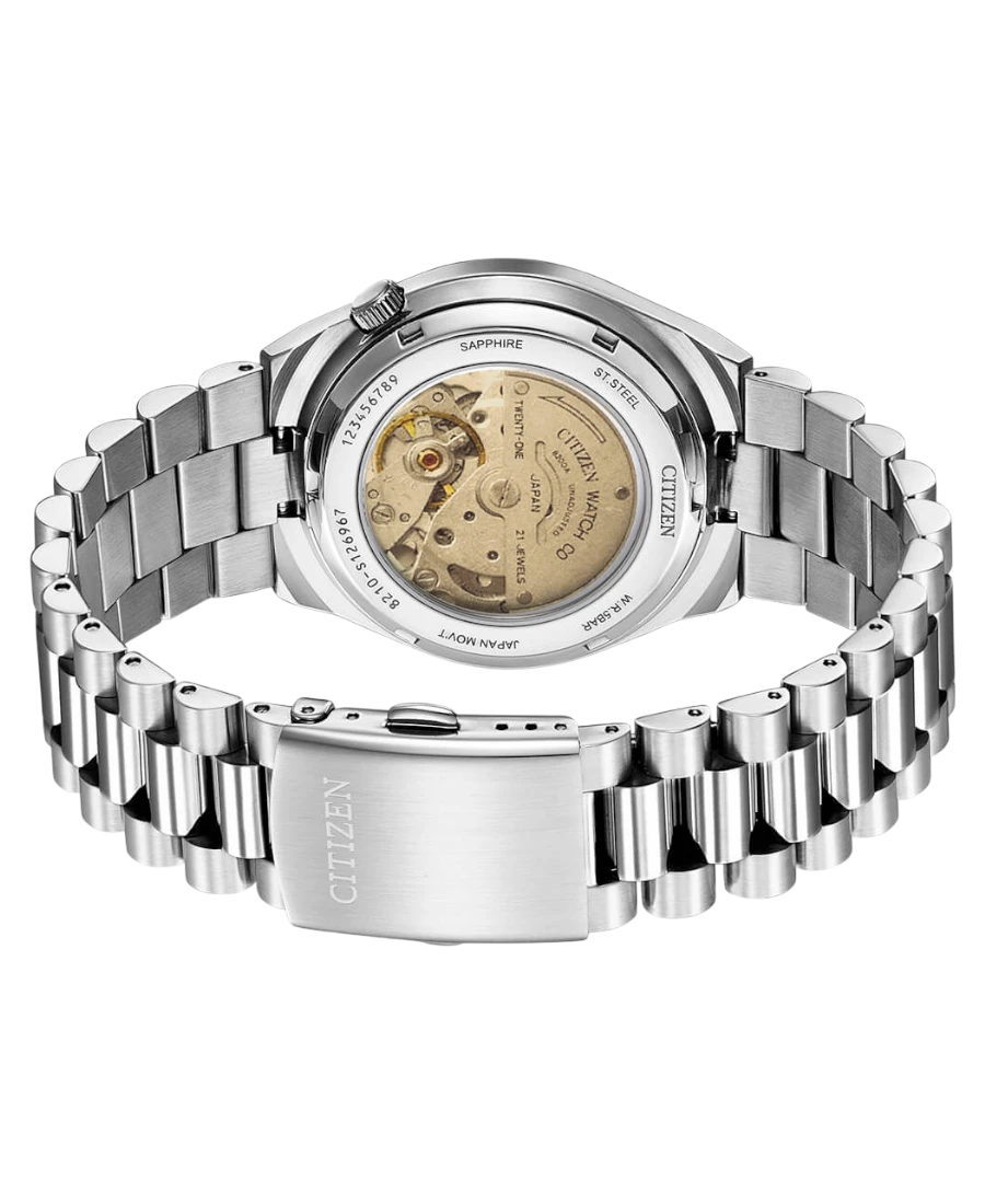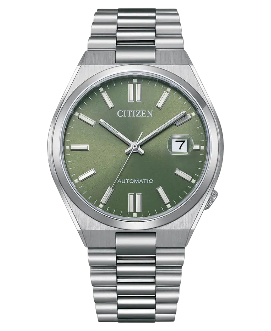 Citizen Tsuyosa Automatisk Grön/Stål 40 mm. Rostfritt stål boett och armband, 40 mm diameter, 11.7 mm tjocklek, grön urtavla (Peaceful Green), safirglas, 5 ATM vattenskydd och datumvisning.