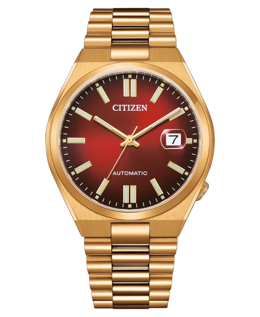 Citizen Tsuyosa Automatisk Guld/Röd 40 mm. Rostfritt stål boett och armband i guld, 40 mm diameter, 12 mm tjocklek, röd urtavla, safirglas, 5 ATM vattenskydd, datumvisning och genomskinligt bakstycke.