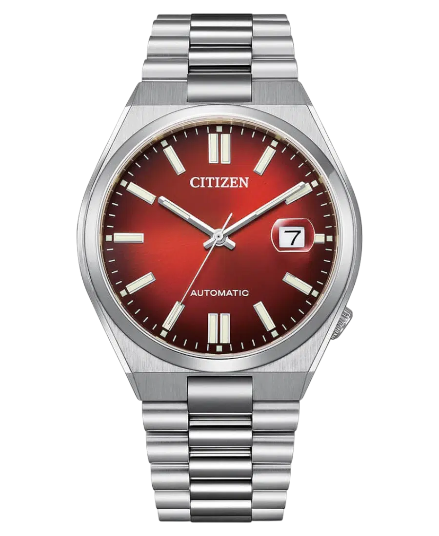 Citizen Tsuyosa Automatisk Röd/Stål 40 mm. Borstat/polerat stål, 40 mm diameter, 11 mm tjocklek, röd urtavla med självlysande markeringar, safirglas, 5 ATM vattenskydd och datumvisning.