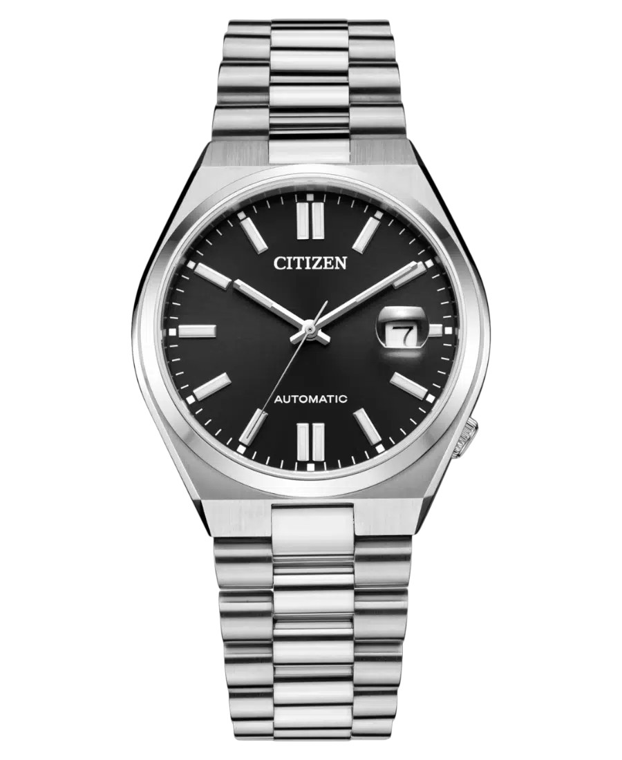 Citizen Tsuyosa Automatisk Svart/Stål 40 mm. Borstat/polerat stål, 40 mm diameter, 12 mm tjocklek, svart urtavla med självlysande visare, safirglas, 5 ATM vattenskydd och datumvisning.
