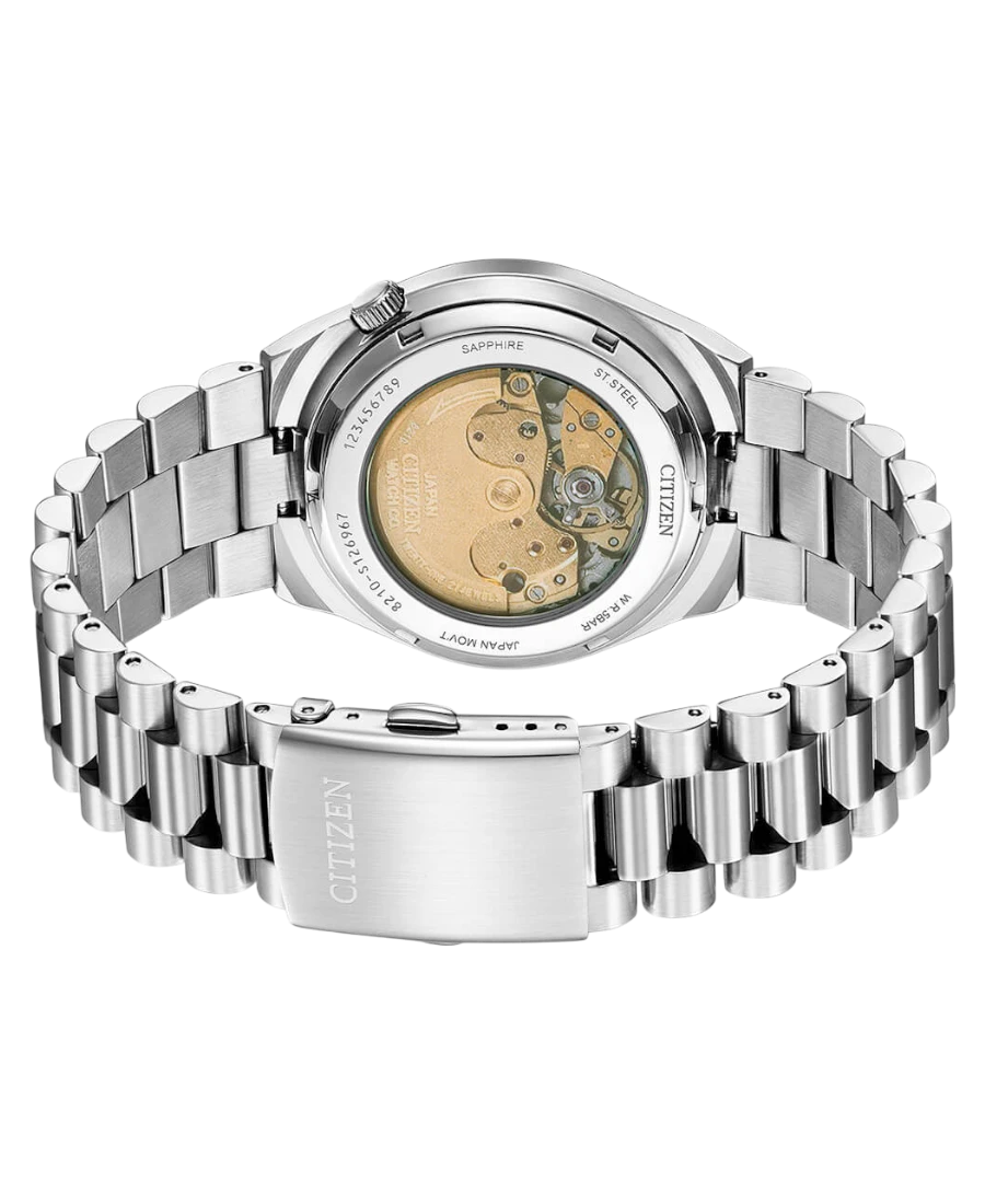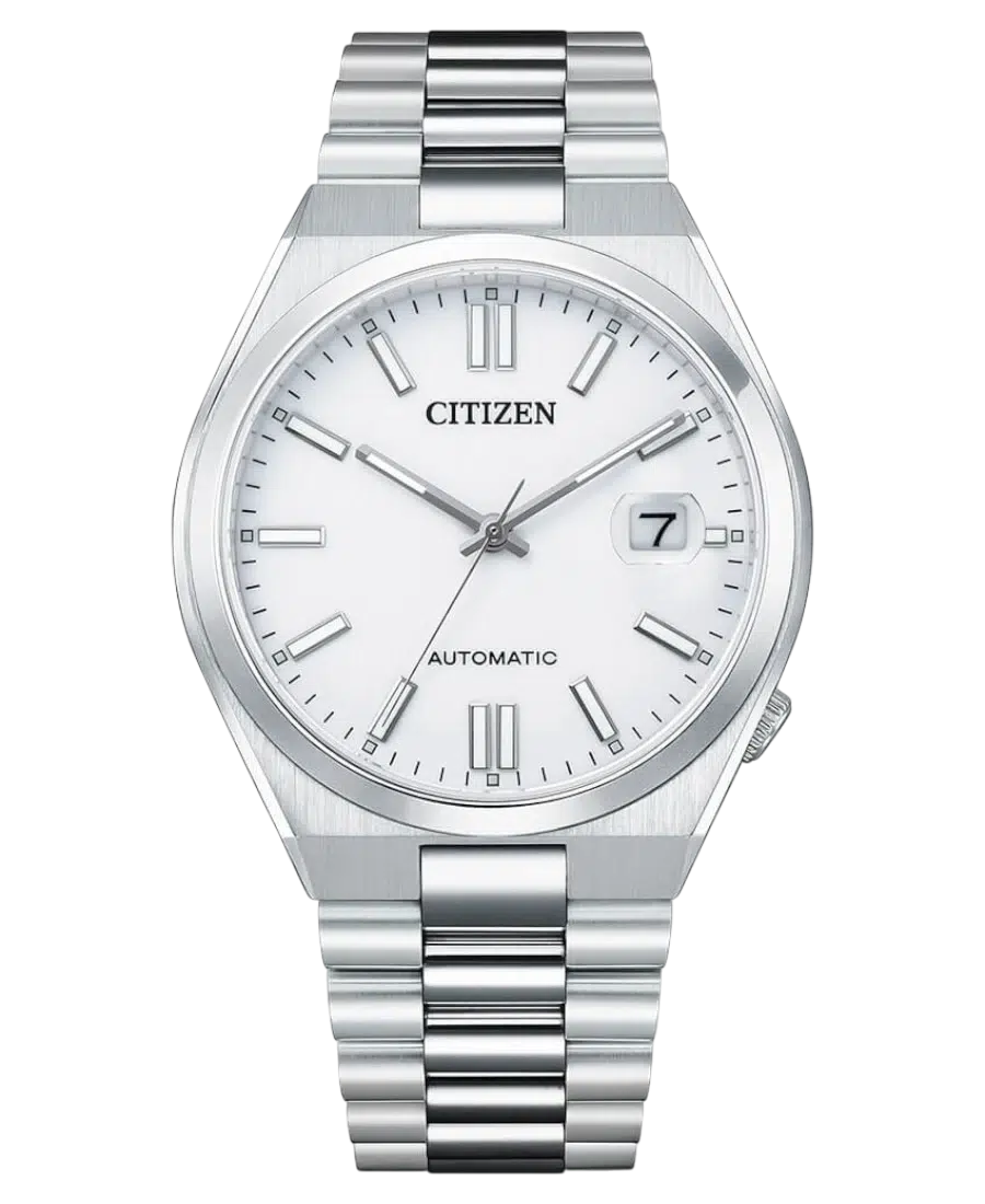 Citizen Tsuyosa Automatisk Vit/Stål 40 mm. Borstat/polerat stål, 40 mm diameter, 11.7 mm tjocklek, vit urtavla med självlysande markeringar, safirglas, 5 ATM vattenskydd och datumvisning.