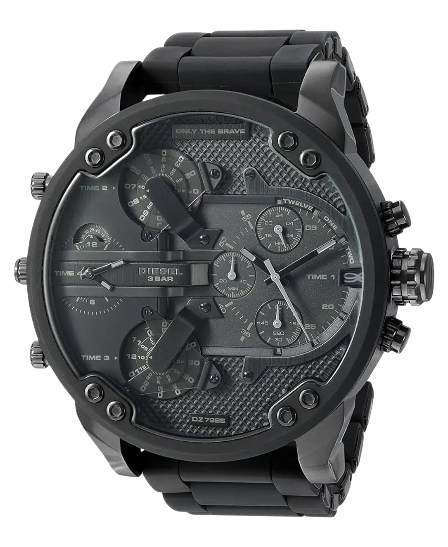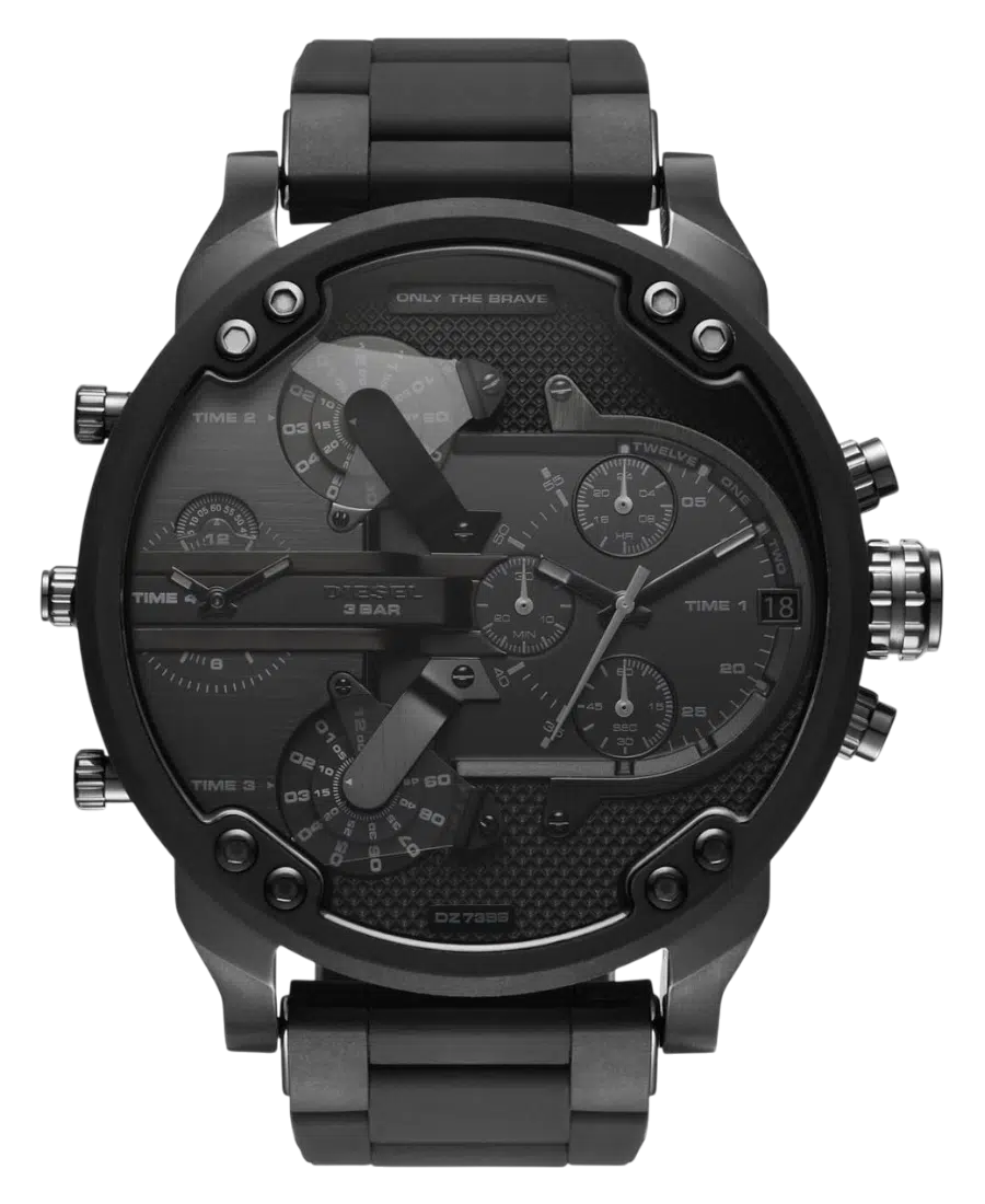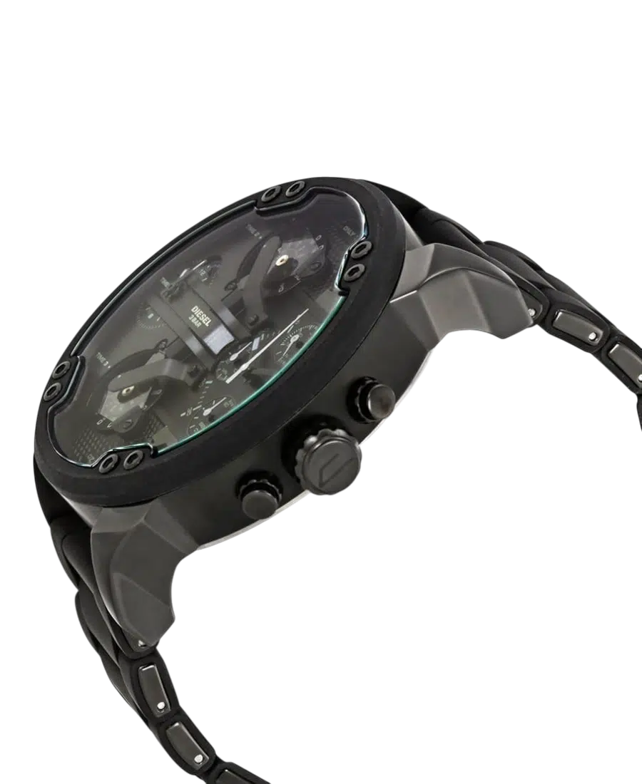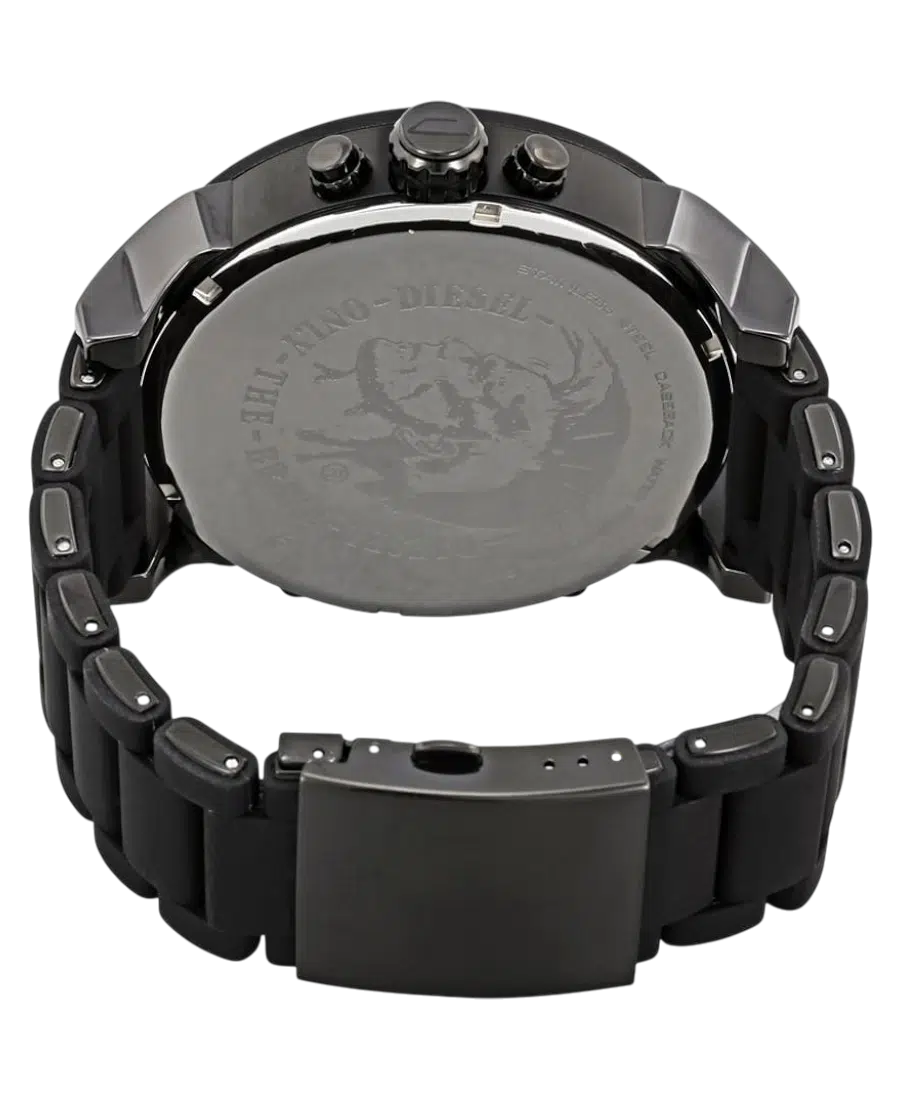 Diesel Chronograph herrklocka med svart stålboett, svart urtavla, stållänk, 55 mm boett, mineralglas, kronograf, GMT-funktion och 3 ATM vattenskydd.