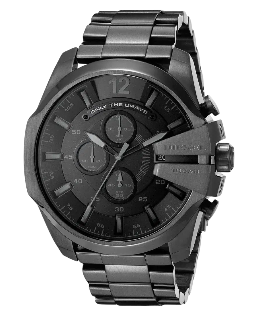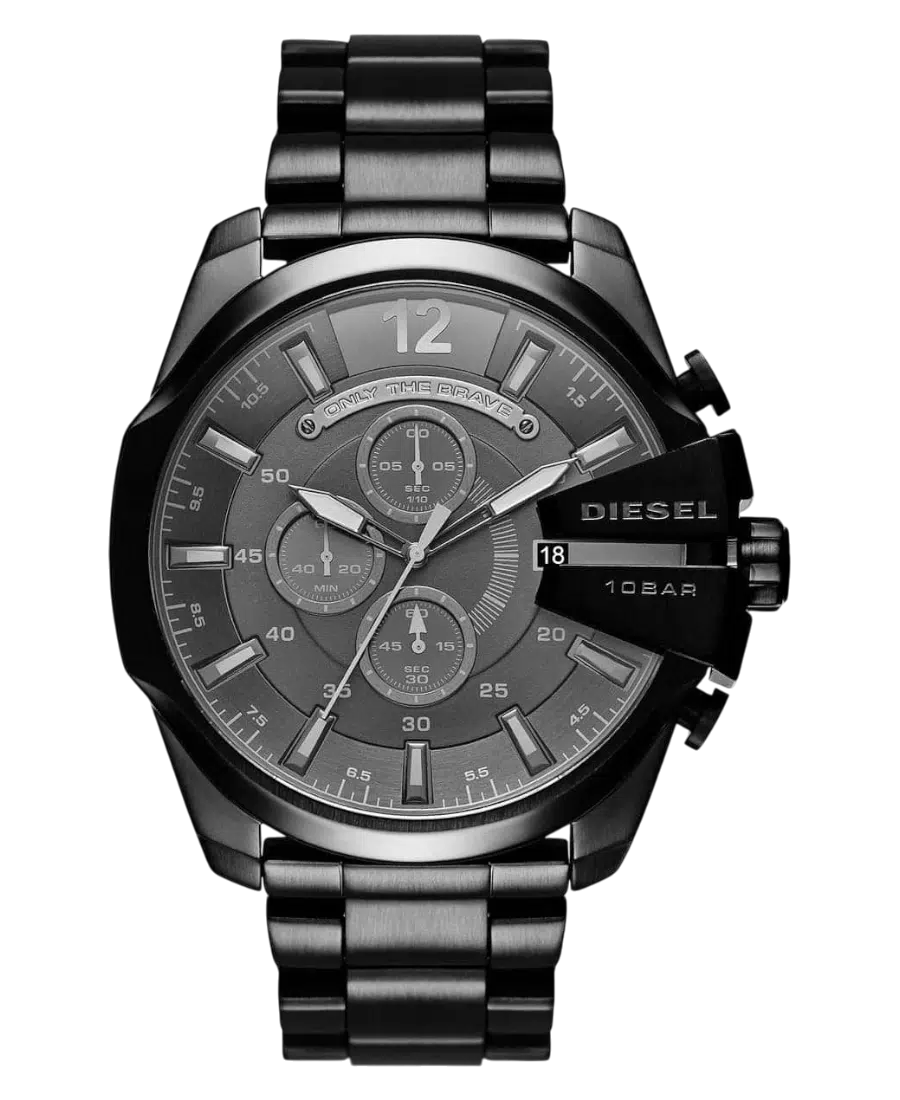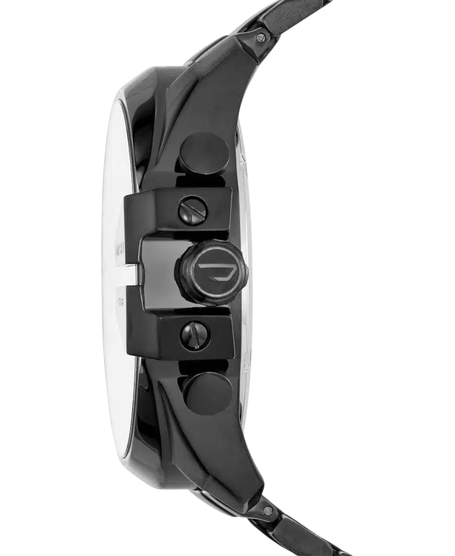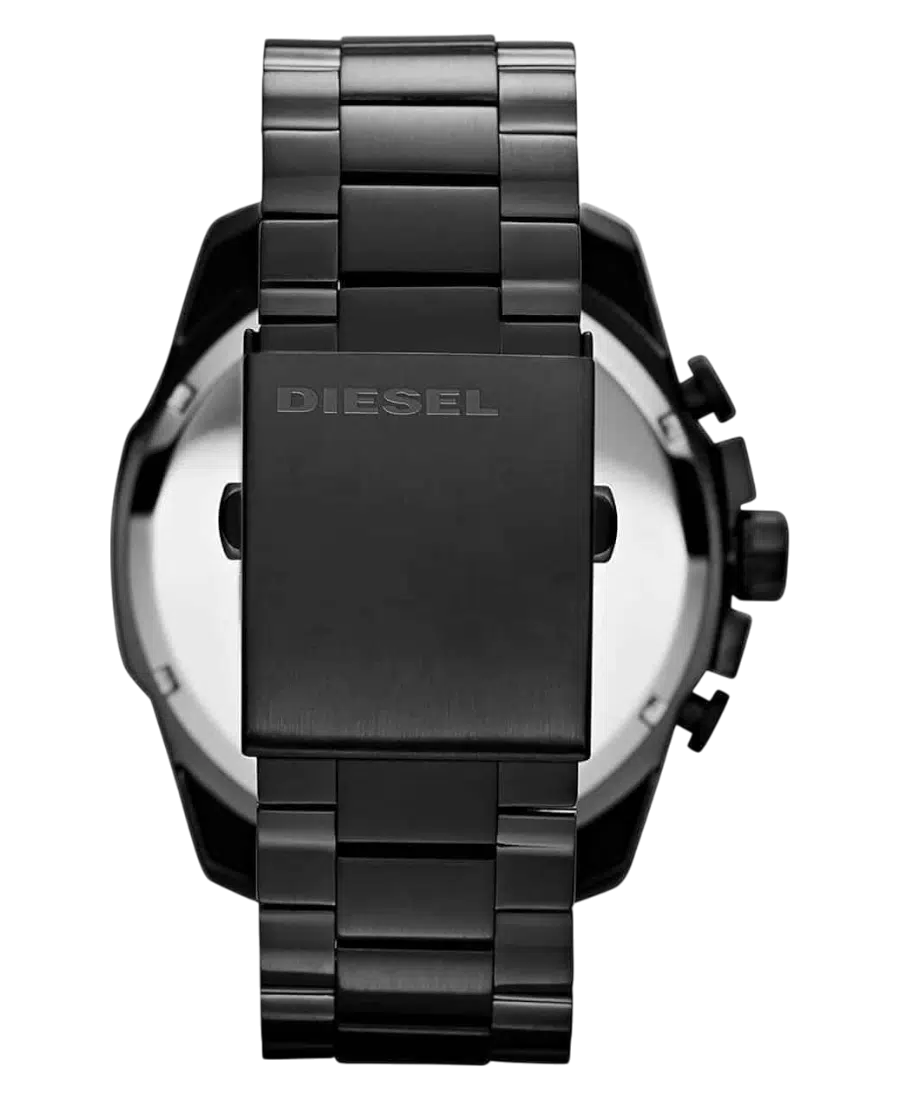 Diesel Chronograph herrklocka i svart stål med 51 mm boett, mineralglas, kvartsurverk, datum och kronograffunktion.
