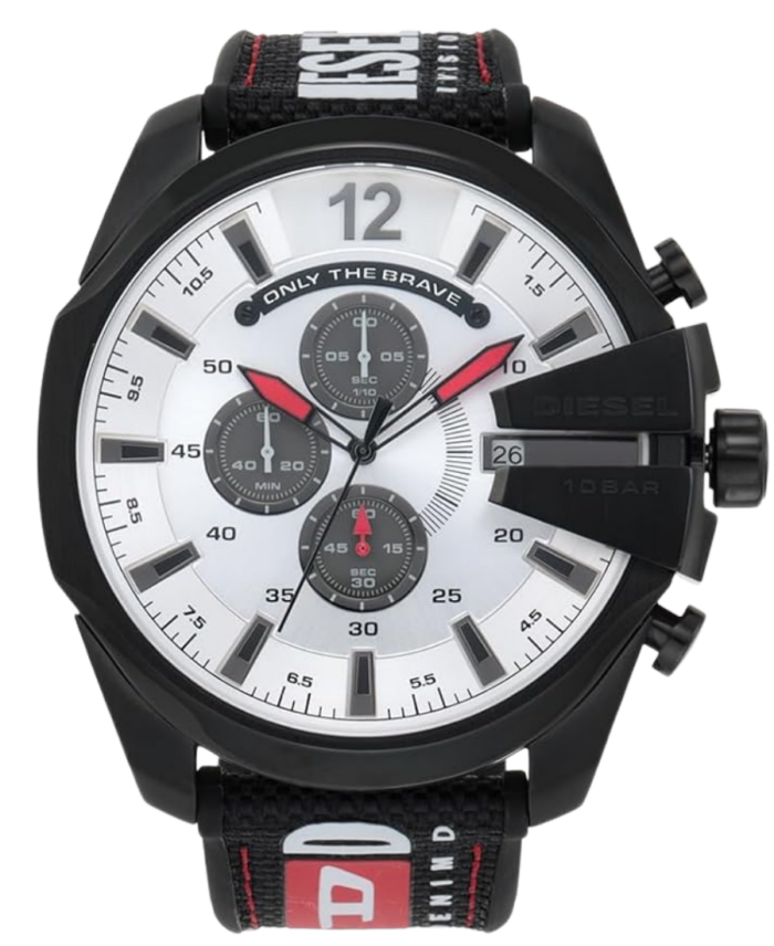 Diesel Mega Chief DZ4512 är en robust och sportig herrklocka med silverfärgad urtavla, kronograf-funktion och svart nylon/silikonrem – perfekt för vardagsstil med industriell känsla.