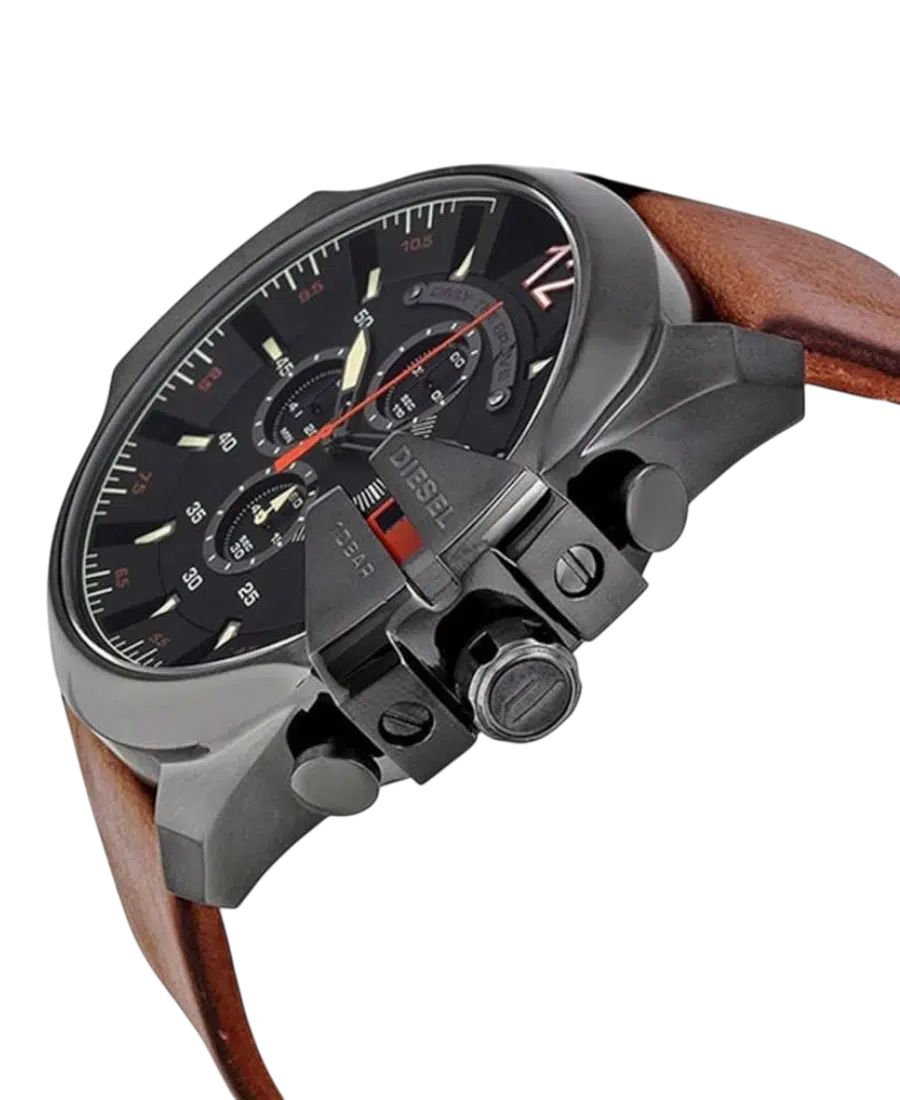 Diesel Mega Chief herrklocka i svart rostfri boett med brun läderrem, 51 mm boett, quartz urverk, datum och mineralglas.