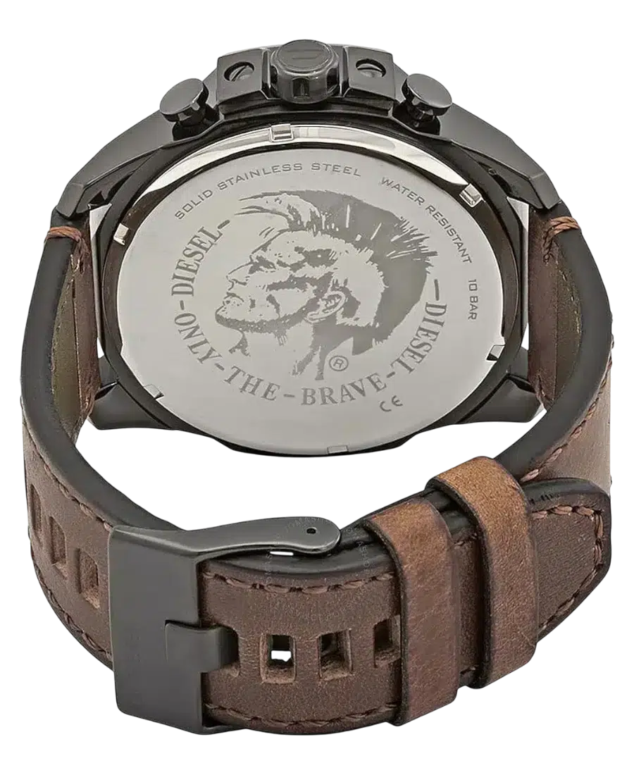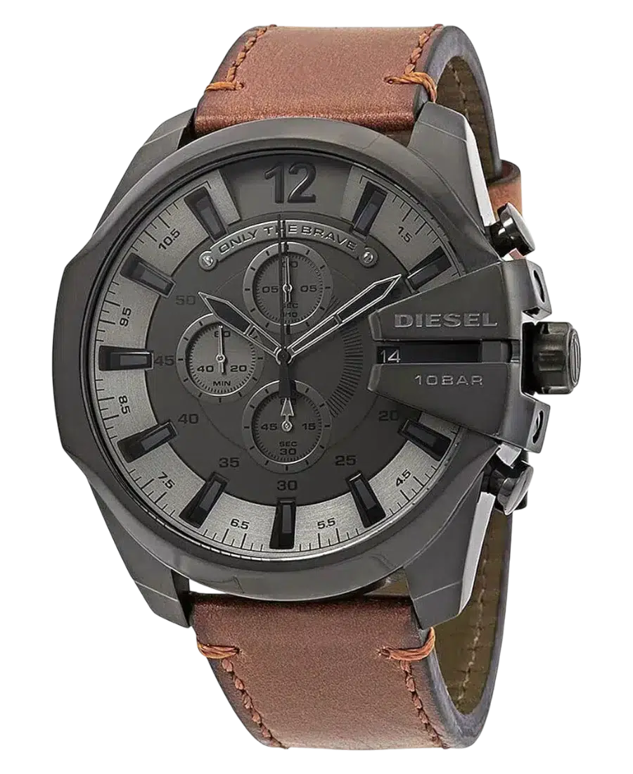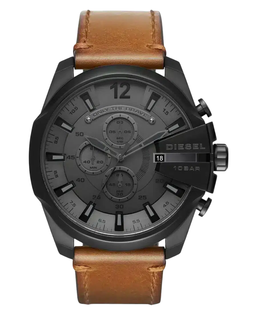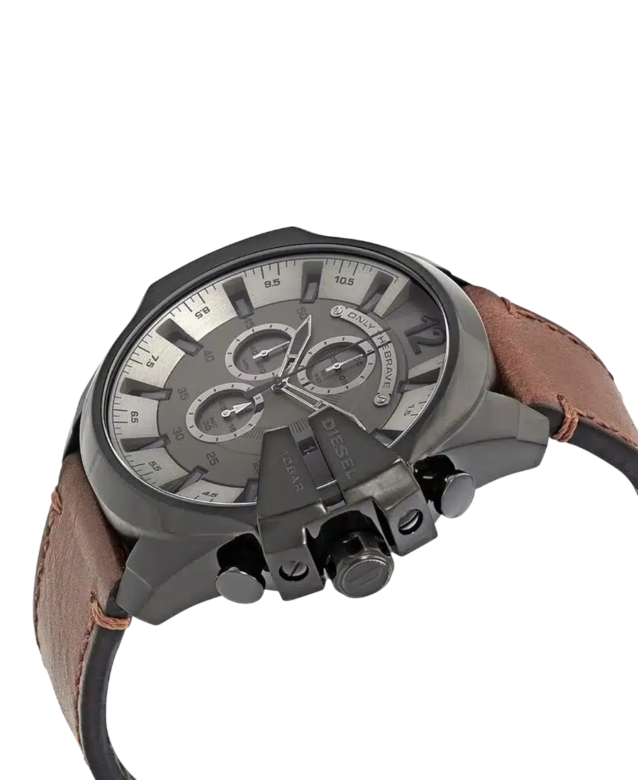 Diesel Mega Chief herrklocka med svart boett, grå urtavla och brunt läderarmband, 51 mm boett, kronograf, datum, mineralglas och 10 ATM vattenskydd.