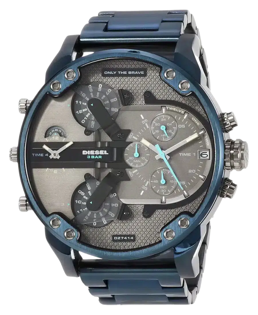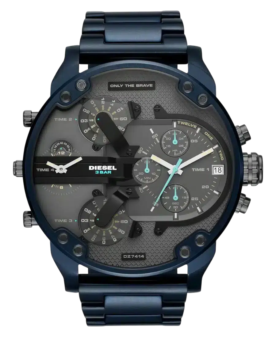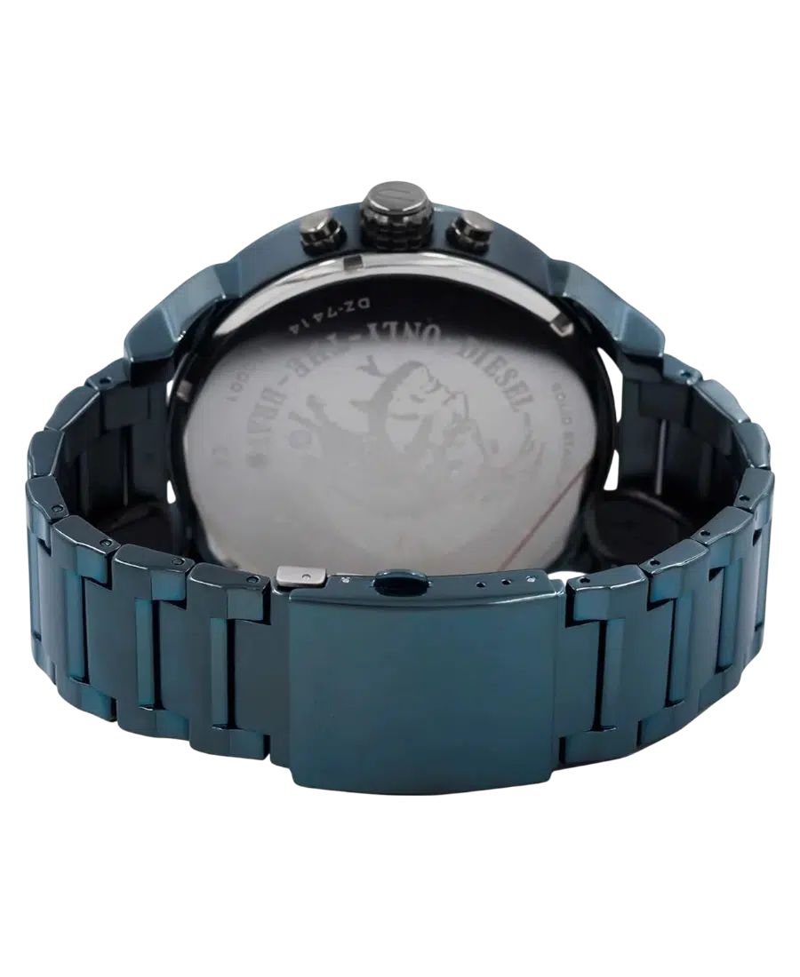 Diesel Mr Daddy 2.0 herrklocka med blå stålboett, grå urtavla, stållänk, 57 mm boett, mineralglas, kronograf och 3 ATM vattenskydd.