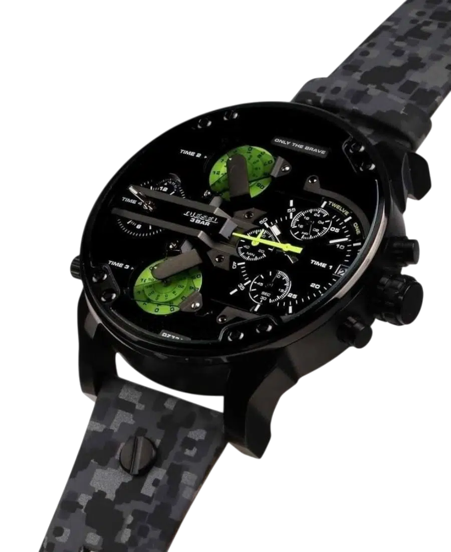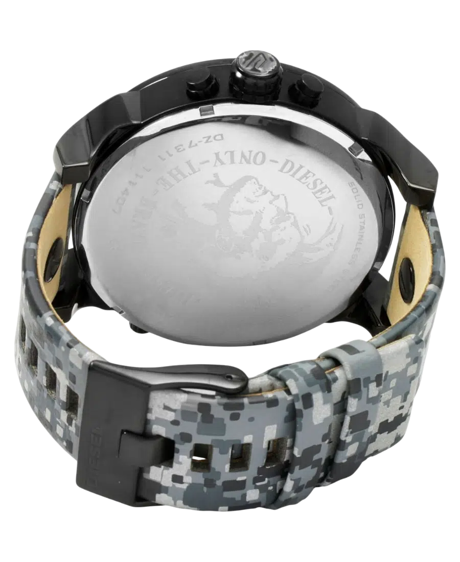 Diesel Mr Daddy 2.0 herrklocka med svart boett, kamouflage-detaljer, svart urtavla, läderarmband och 57 mm boett. Quartz, datum, kronograf och 3 ATM vattenskydd.