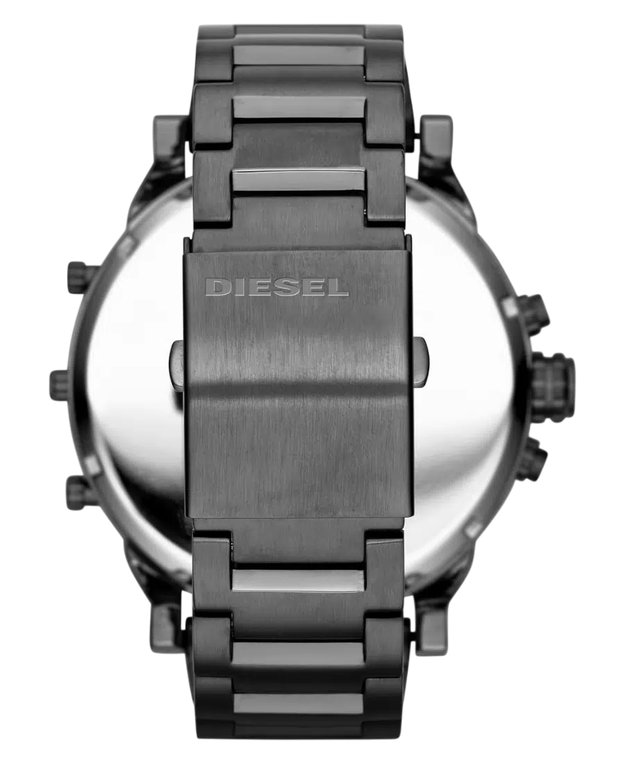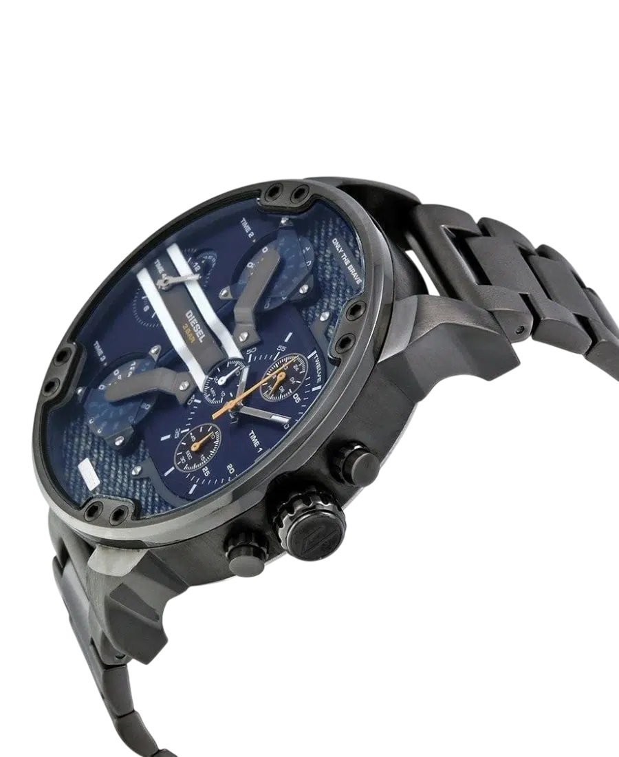 Diesel Mr Daddy 2.0 herrklocka i gunmetal stål med blå/grå/svart urtavla, 56 mm boett, mineralglas, kronograf, 24h-display, sekundär tidszon och 3 ATM vattenskydd.
