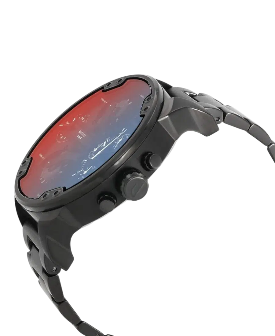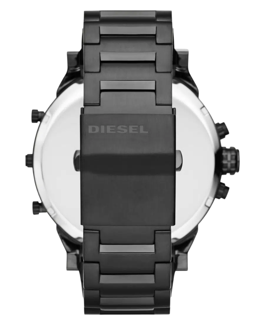 Diesel Mr Daddy 2.0 herrklocka med svart stålboett, flerfärgad urtavla, stållänk, 57 mm boett, mineralglas, kronograf och 3 ATM vattenskydd.