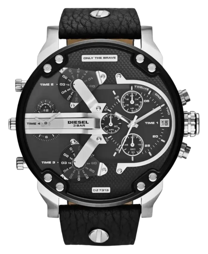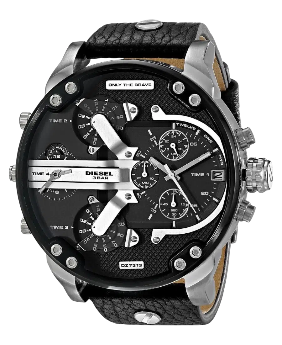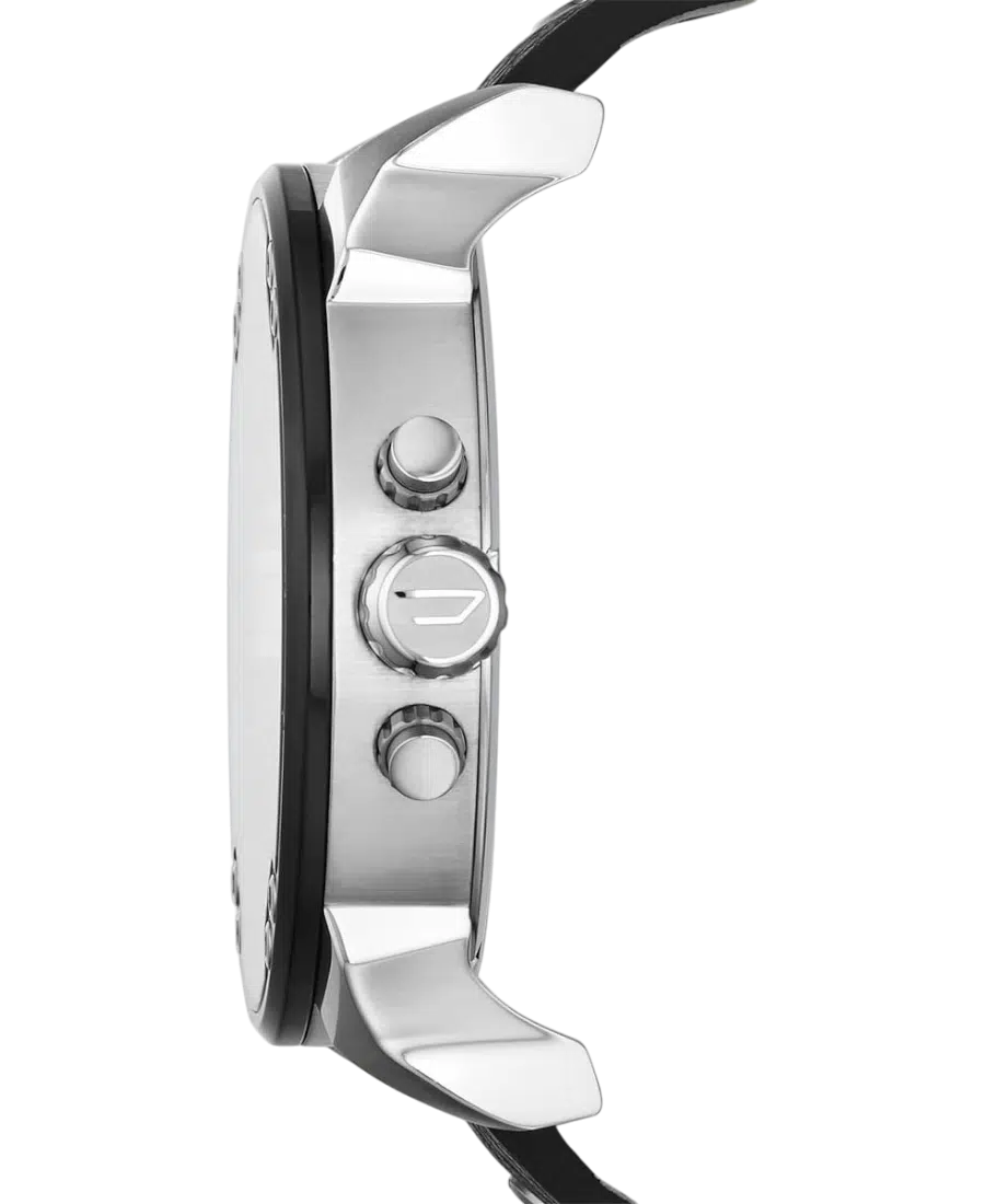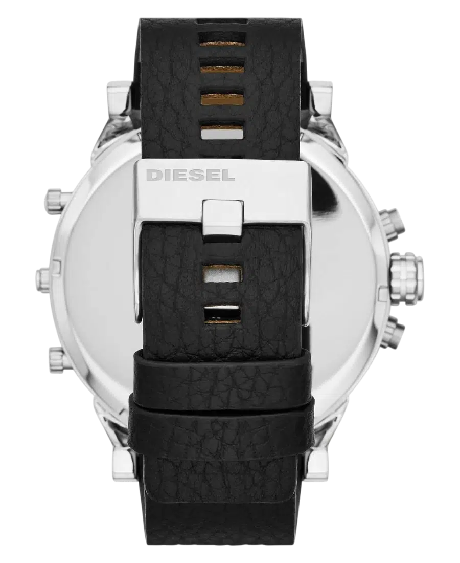 Diesel Mr. Daddy 2.0 herrklocka med 57 mm boett i rostfritt stål, svart urtavla, mineralglas, svart läderarmband, kronograf, datum och 3 ATM vattenskydd.