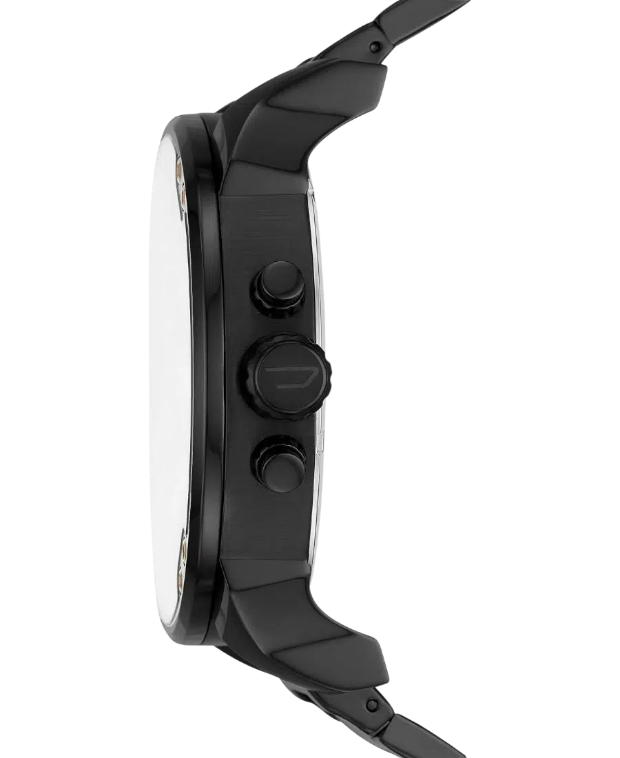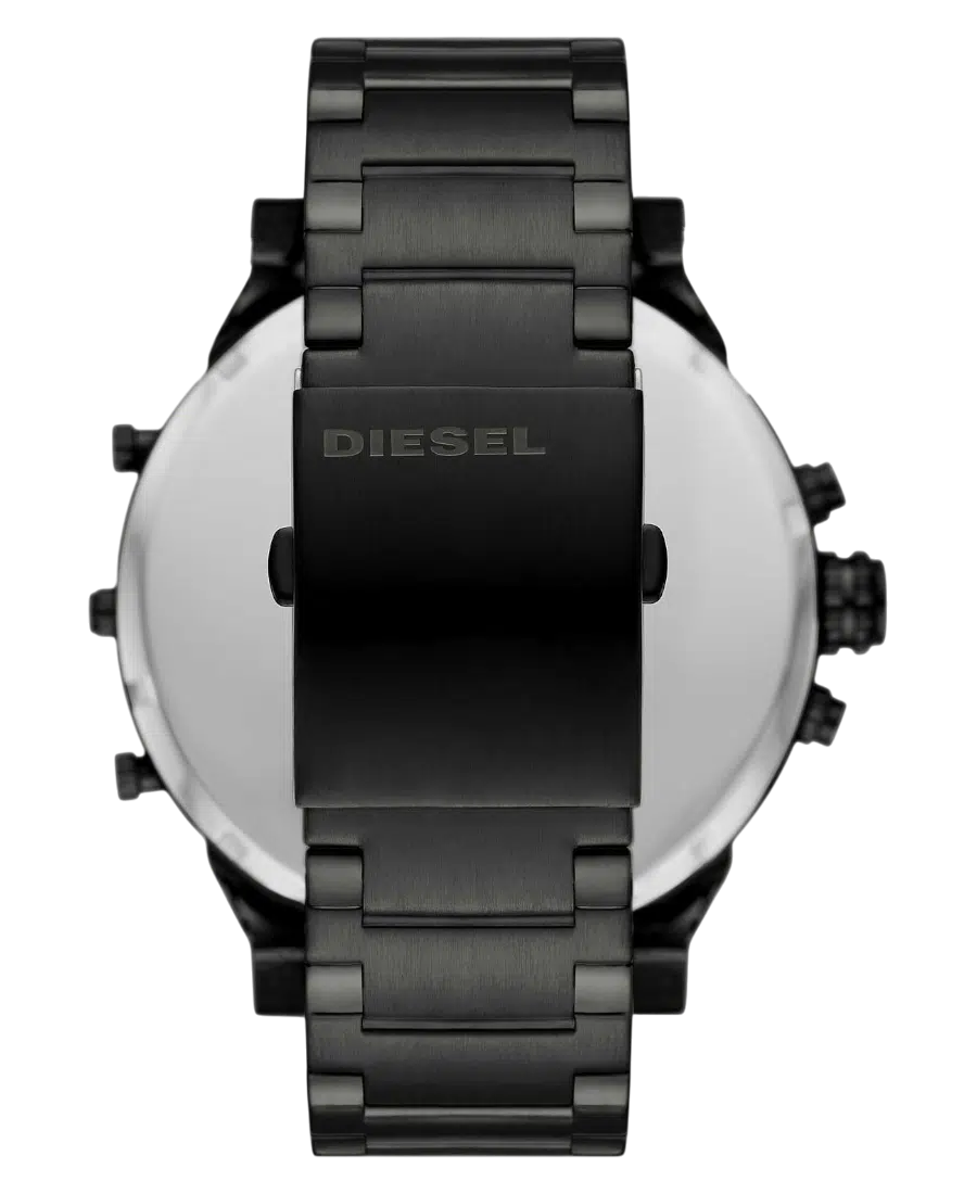 Diesel Mr Daddy 2.0 herrklocka med 57 mm svart stålboett, svart urtavla, svart stållänk, mineralglas, kronograf, multimovements och 3 ATM vattenskydd.