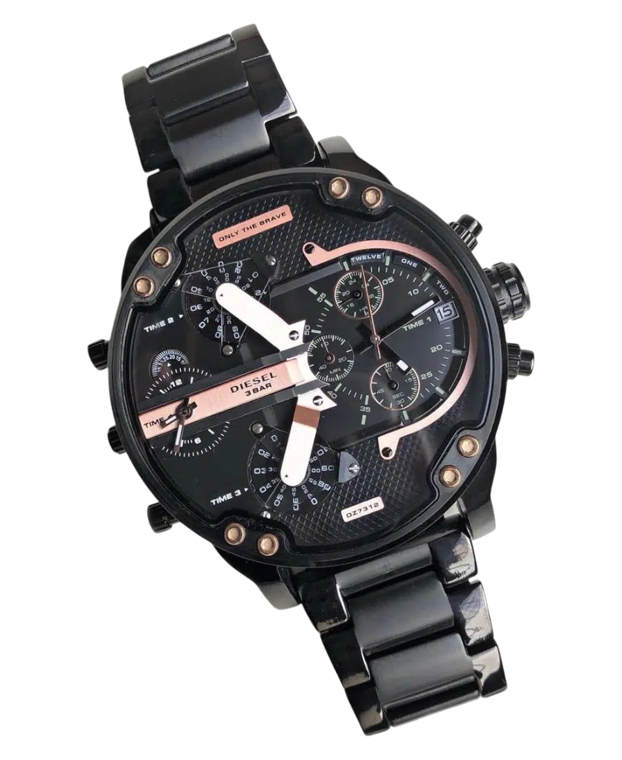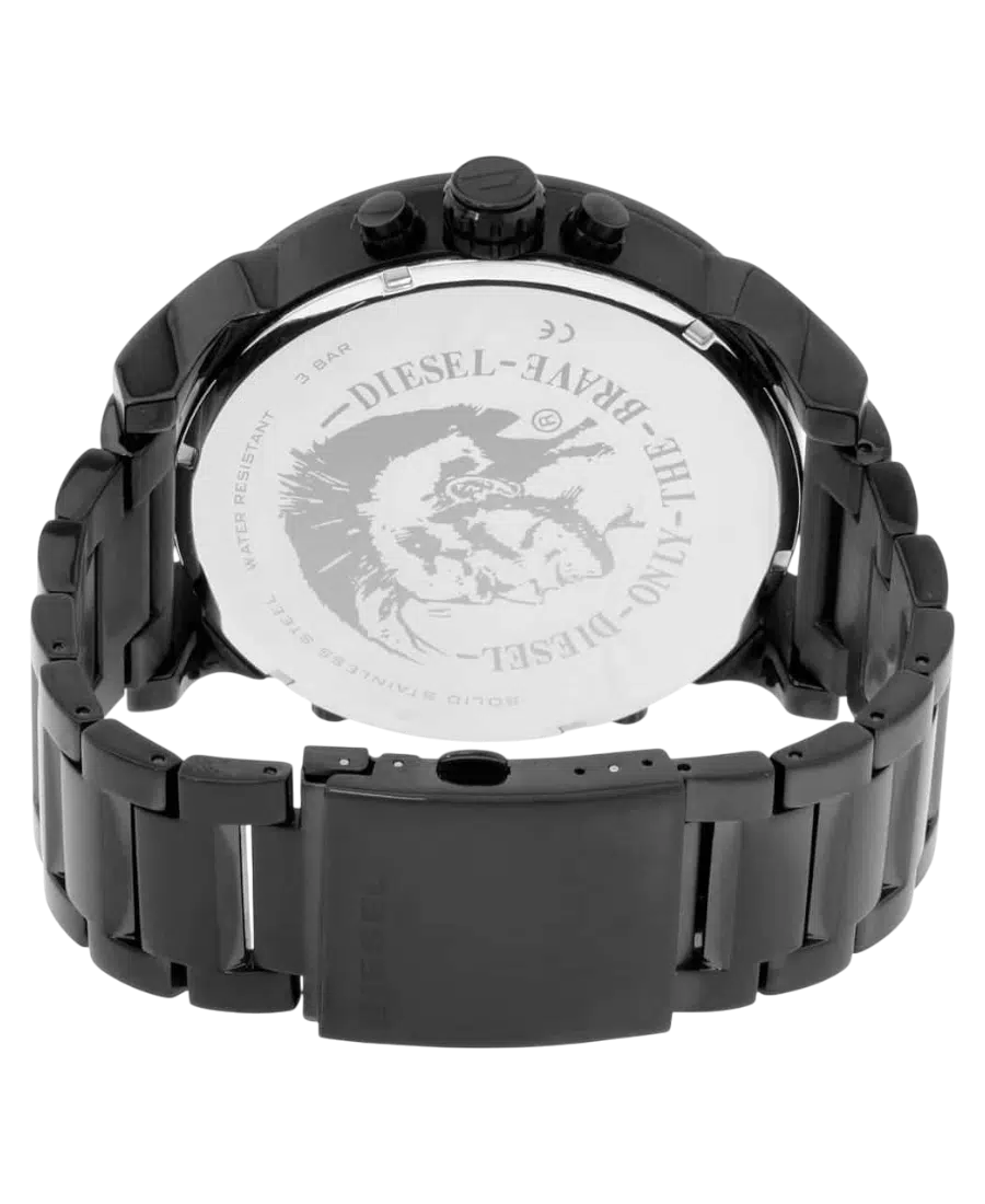 Diesel Mr. Daddy 2.0 herrklocka i svart stål, 57 mm boett, svart urtavla, mineralglas, datum, kronograf och 3 ATM vattenskydd.
