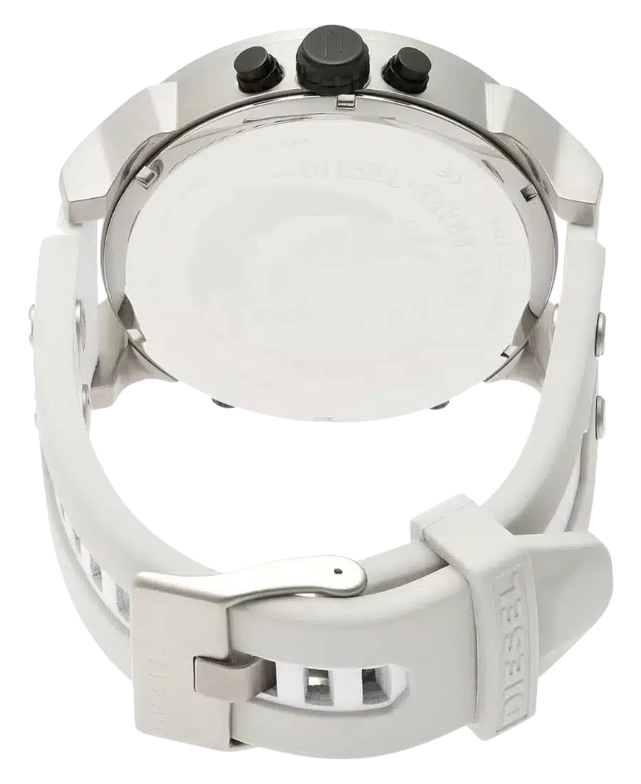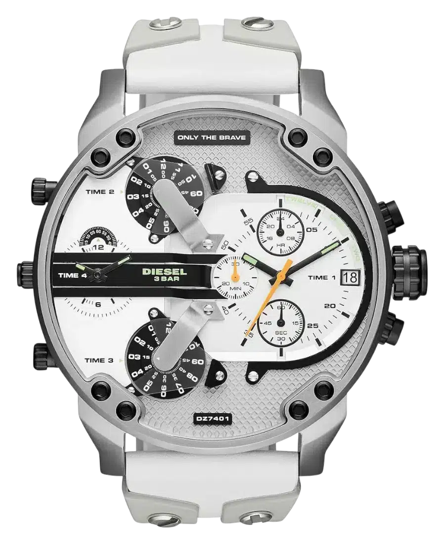 Diesel Mr Daddy 2.0 herrklocka med 57 mm boett, vit urtavla, vitt gummi/läderband, mineralglas, kronograf, GMT-funktion och 3 ATM vattenskydd.