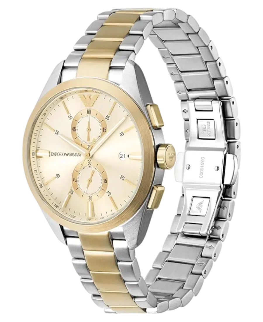 Emporio Armani Claudio AR11605 är en stilfull herrklocka med boett på 43 mm i tvåfärgat rostfritt stål. Krämfärgad urtavla med kronograf och datum. Armbandet i tvåfärgat stål är 22 mm brett. Kvartsurverk, mineralglas, vattentålig till 50 meter. Boettens tjocklek 11 mm. 2 års garanti.