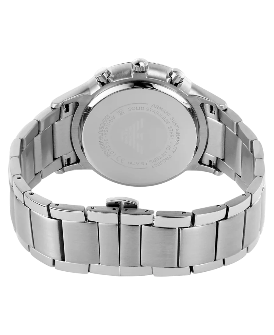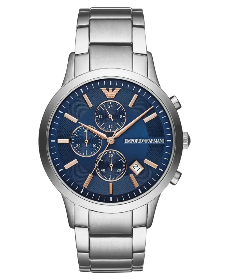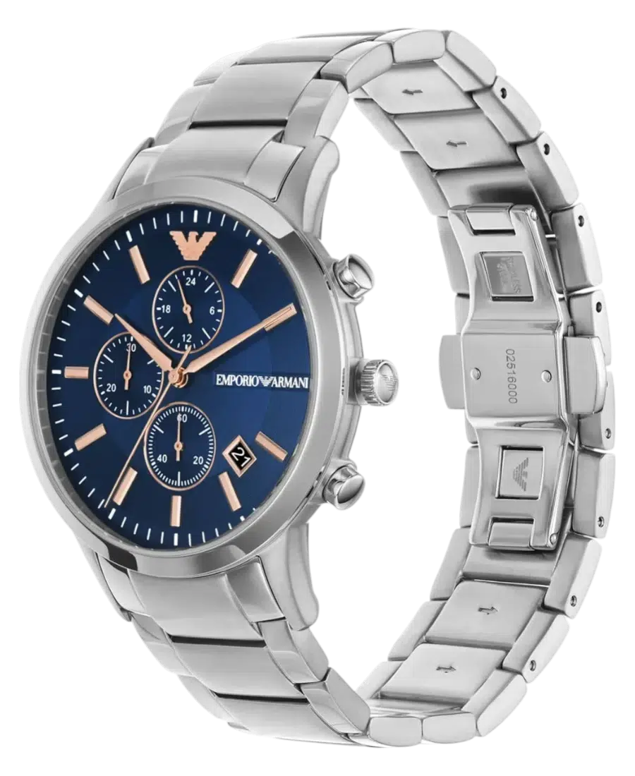 Emporio Armani Renato AR11458 är en kraftfull herrklocka med boett på 43 mm i rostfritt stål. Den blå solstråleurtavlan har kronograf och datum. Armbandet i stål är 22 mm brett. Kvartsurverk, mineralglas, vattentålighet 50 meter. Boettens tjocklek 11 mm. 2 års garanti.