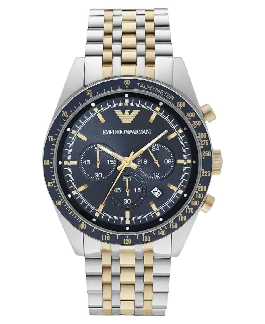 Emporio Armani Tazio är en sportig herrklocka med en boett på 46 mm i tvåfärgat rostfritt stål. Den blå urtavlan med kronograf och tydliga index gör den elegant men ändå maskulin. Armbandet i två toner av stål ger en exklusiv känsla. Klockan har kvartsurverk, mineralglas och vattentäthet 50 meter. Boettjocklek 12 mm.