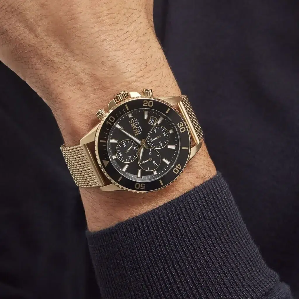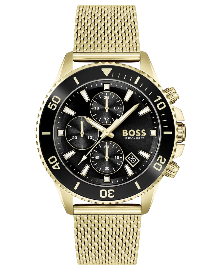 Hugo Boss Admiral 1513906 är en sportig och elegant herrklocka med svart urtavla och guldfärgat stålarmband, perfekt för både vardag och formella tillfällen.