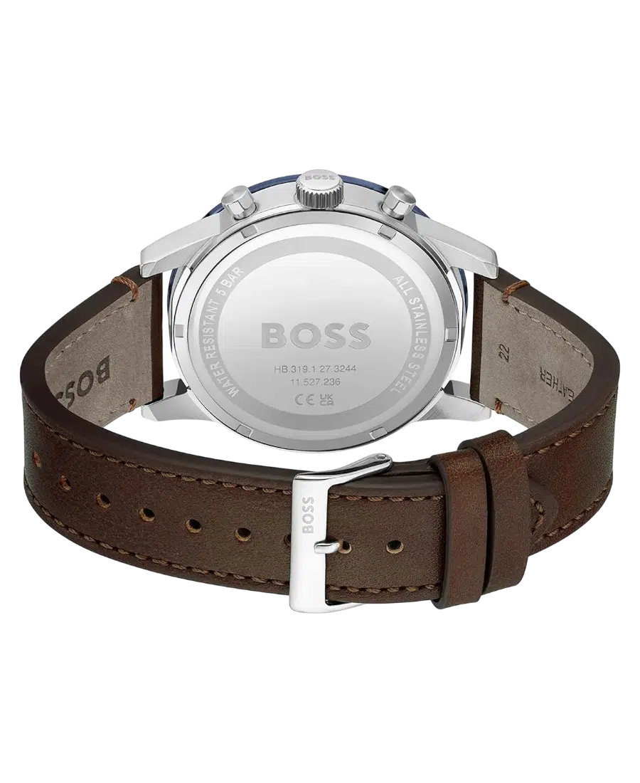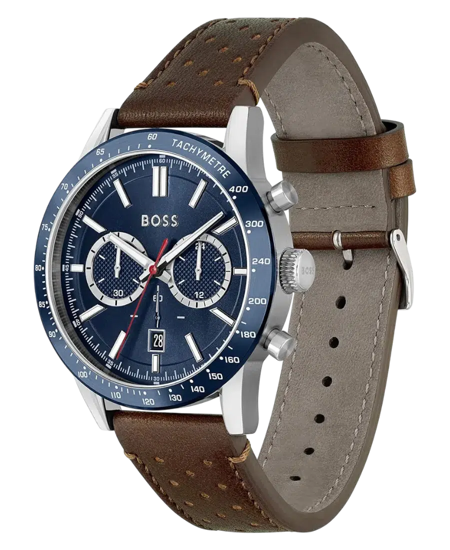 Hugo Boss herrklocka Allure med blå urtavla, boett i rostfritt stål och brunt läderarmband. 44 mm boett, kvartsurverk, datumvisning, kronograf och 5 ATM vattenskydd.