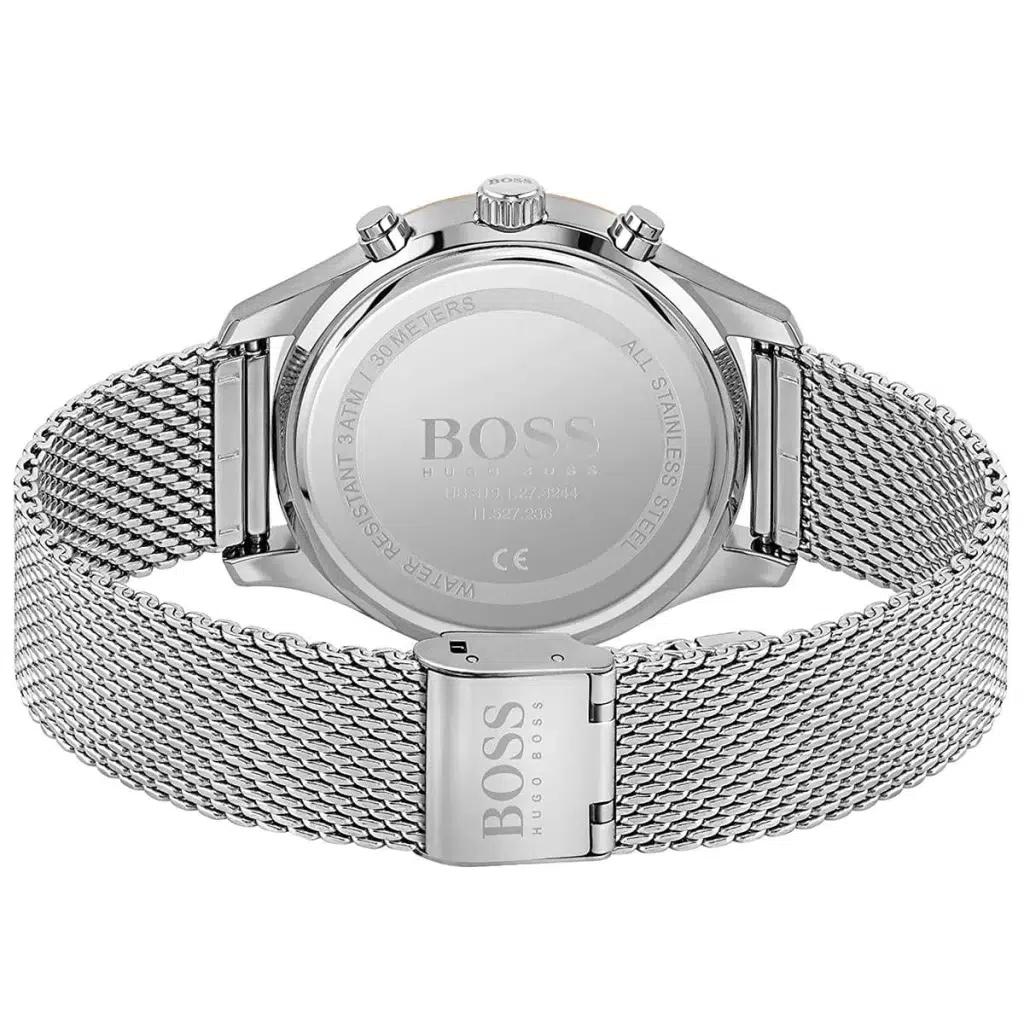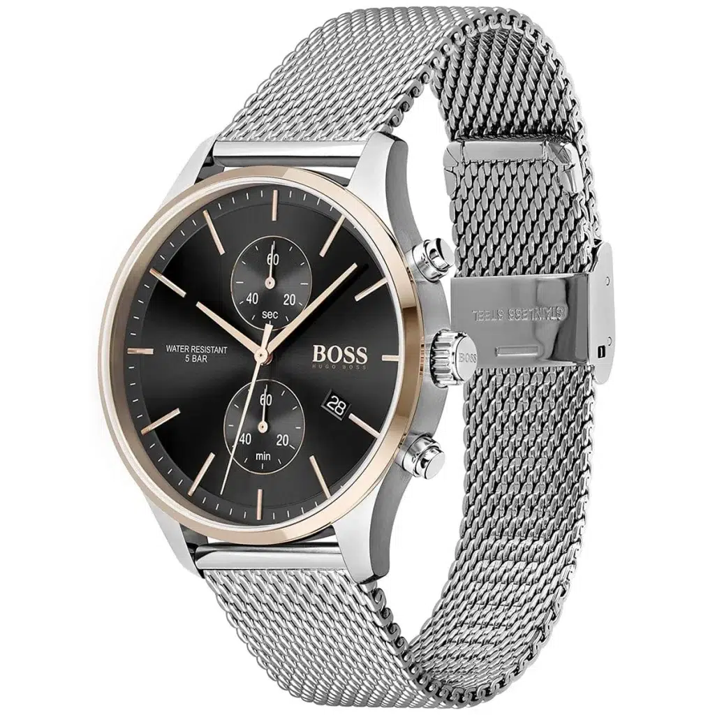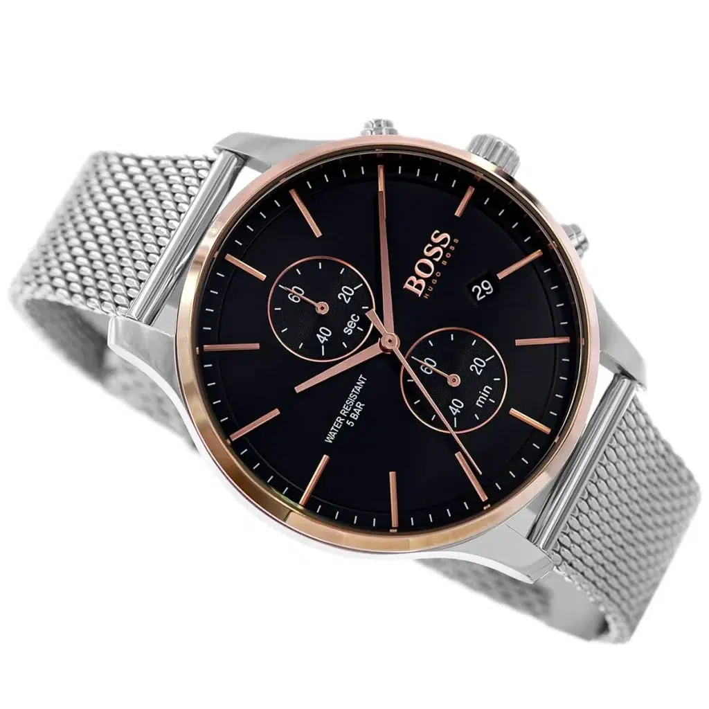 Hugo Boss Associate 1513805 är en elegant och sportig herrklocka med svart urtavla och silverfärgat mesharmband, perfekt för både vardag och formella tillfällen.