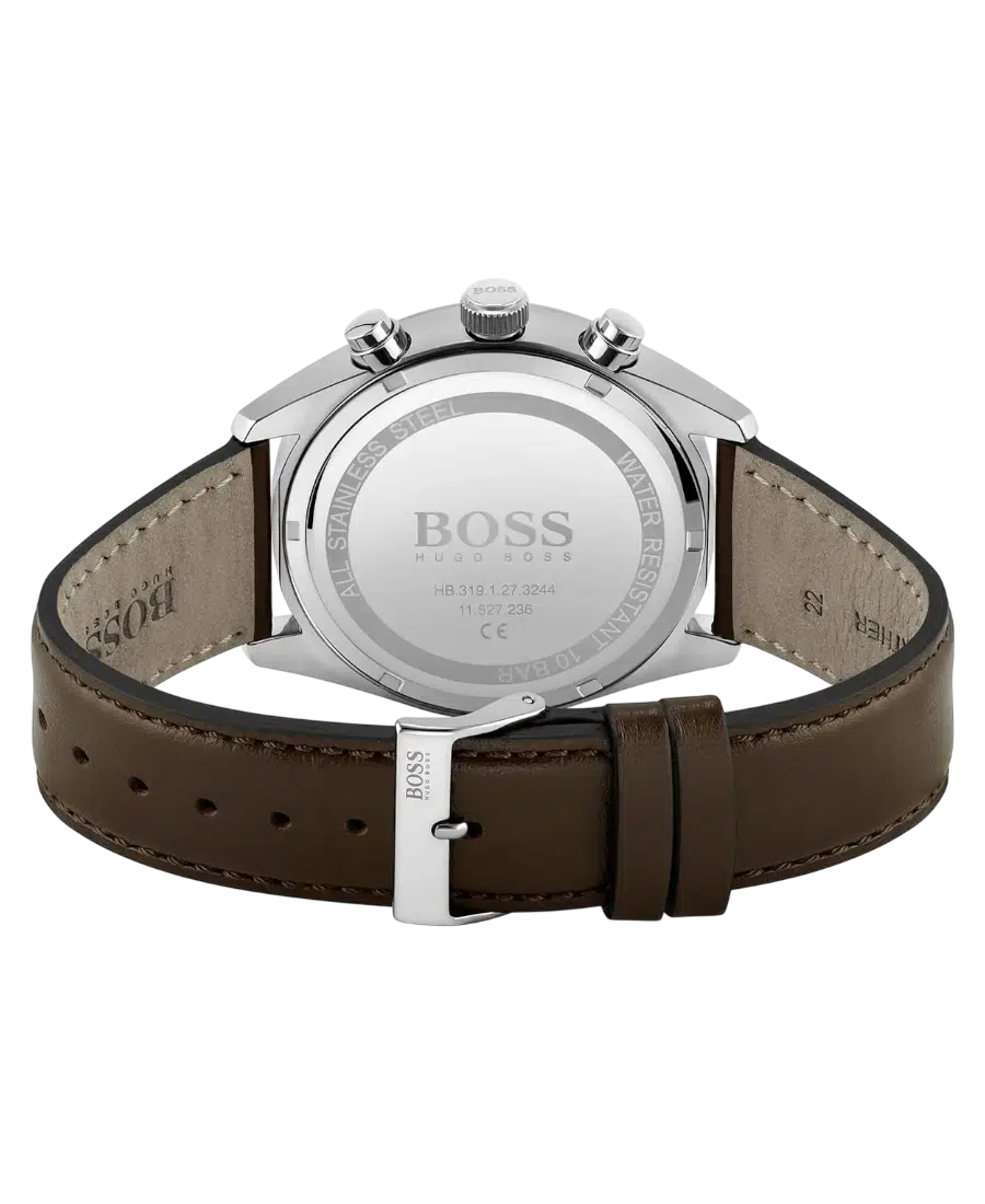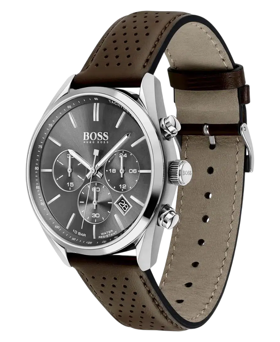 Hugo Boss herrklocka Champion med grå urtavla, boett i rostfritt stål och brunt läderarmband. 44 mm boett, kvartsurverk, datumvisning, kronograf och 10 ATM vattenskydd.