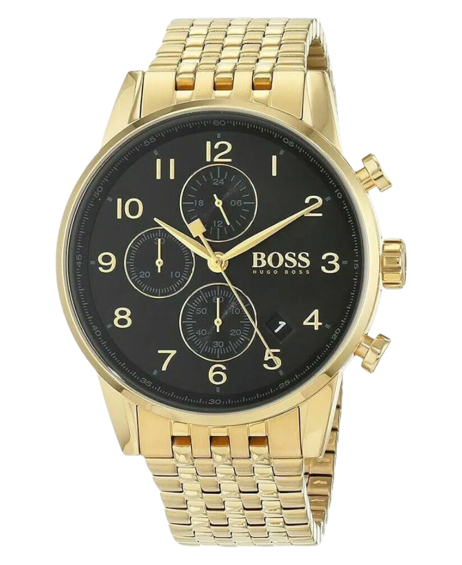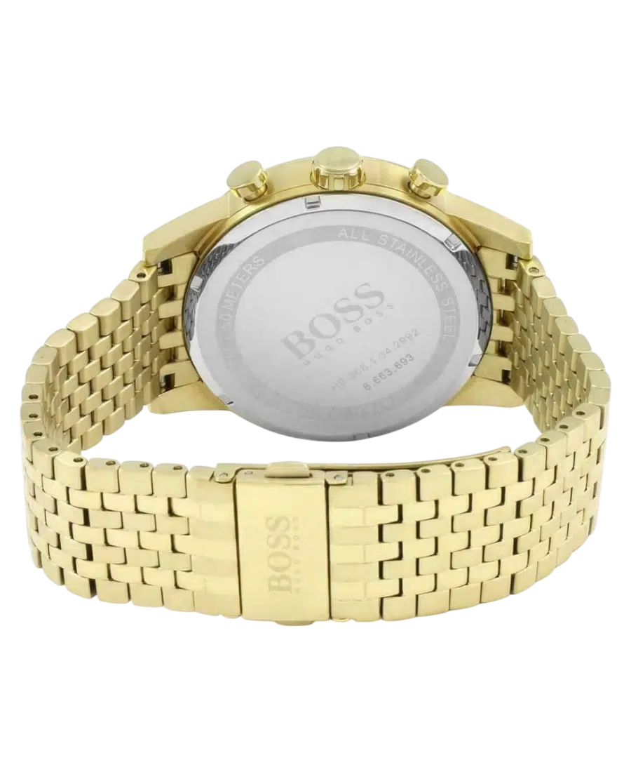 Hugo Boss herrklocka i gulguldtonat stål med svart urtavla och kronograf. 44 mm boett, kvartsurverk, datumvisning och 5 ATM vattenskydd.