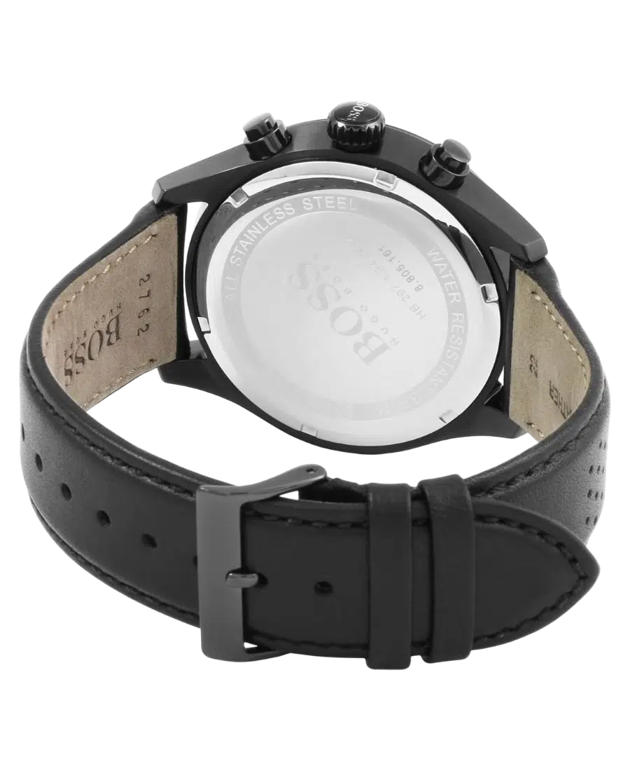 Hugo Boss herrklocka med svart urtavla, boett i rostfritt stål och svart läderarmband. 43 mm boett, kvartsurverk, datumvisning, kronograf och 3 ATM vattenskydd.