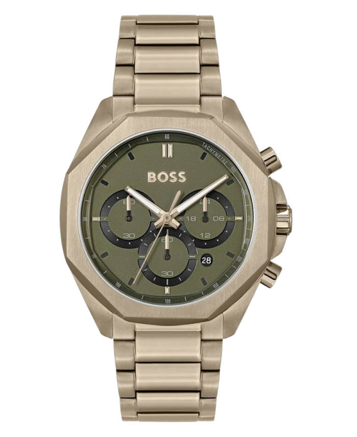 Hugo Boss Cloud 1514019 är en elegant herrklocka med grön urtavla och rose gold-tonad rostfri stållänk, perfekt för både vardag och formella tillfällen.