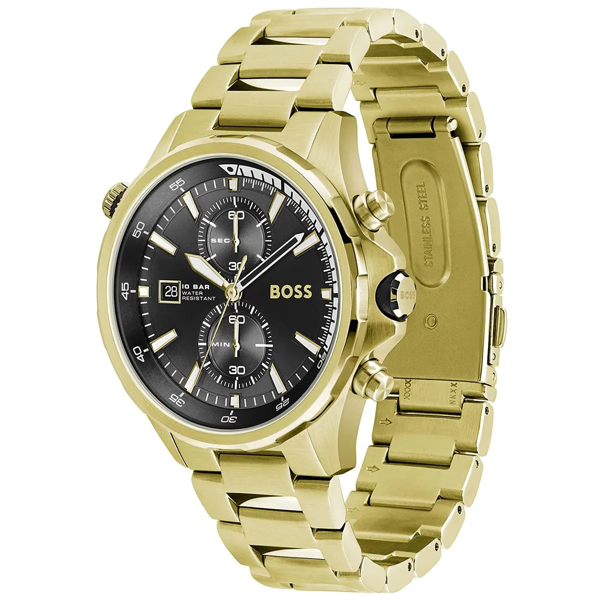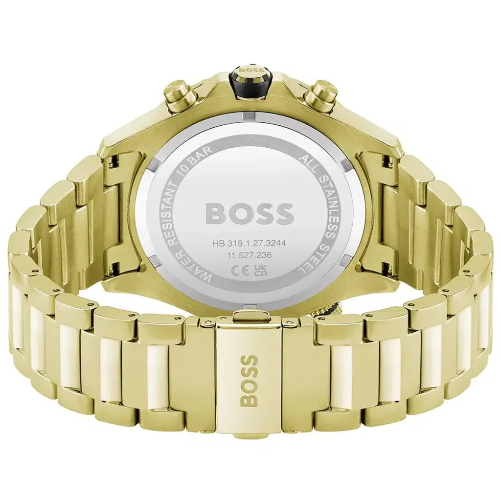 Hugo Boss Globetrotter 1513932 är en sportig och elegant herrklocka med svart urtavla och guldfärgat stålarmband, perfekt för både vardag och formella tillfällen.