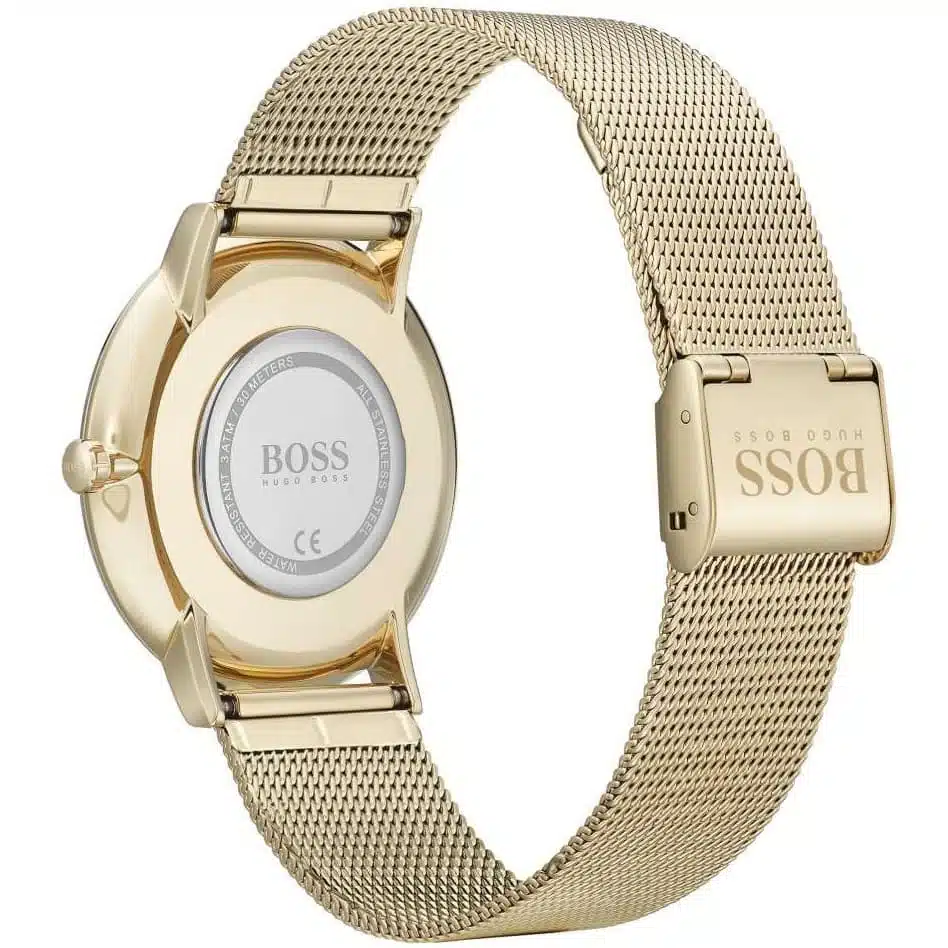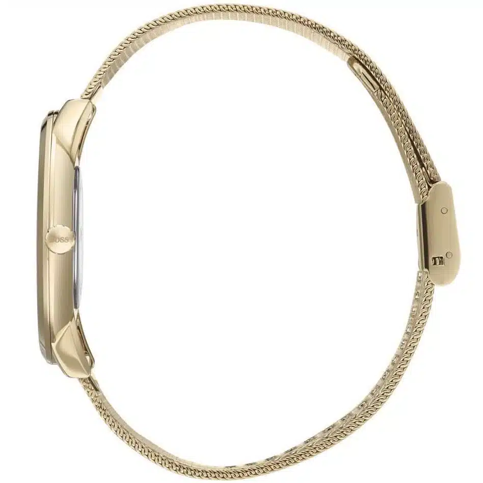 Hugo Boss Horizon 1513735 är en elegant herrklocka med svart urtavla och guldfärgat mesh-armband, perfekt för både vardag och formella tillfällen.