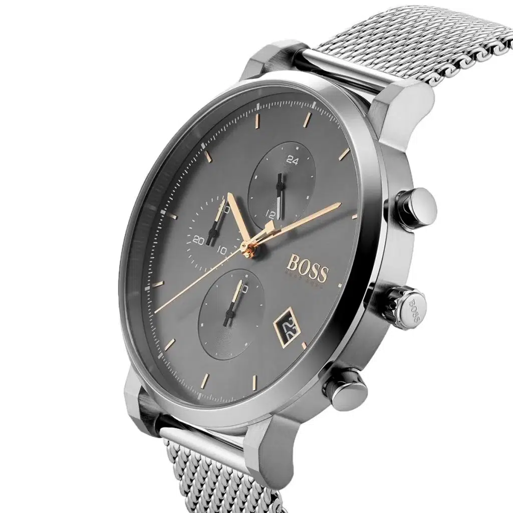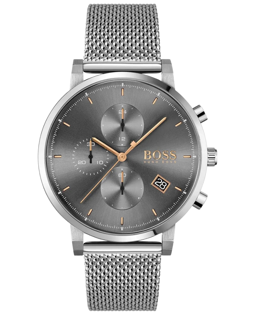 Hugo Boss Integrity 1513807 är en elegant herrklocka med grå urtavla och silverfärgat metallarmband, perfekt för både vardag och formella tillfällen.