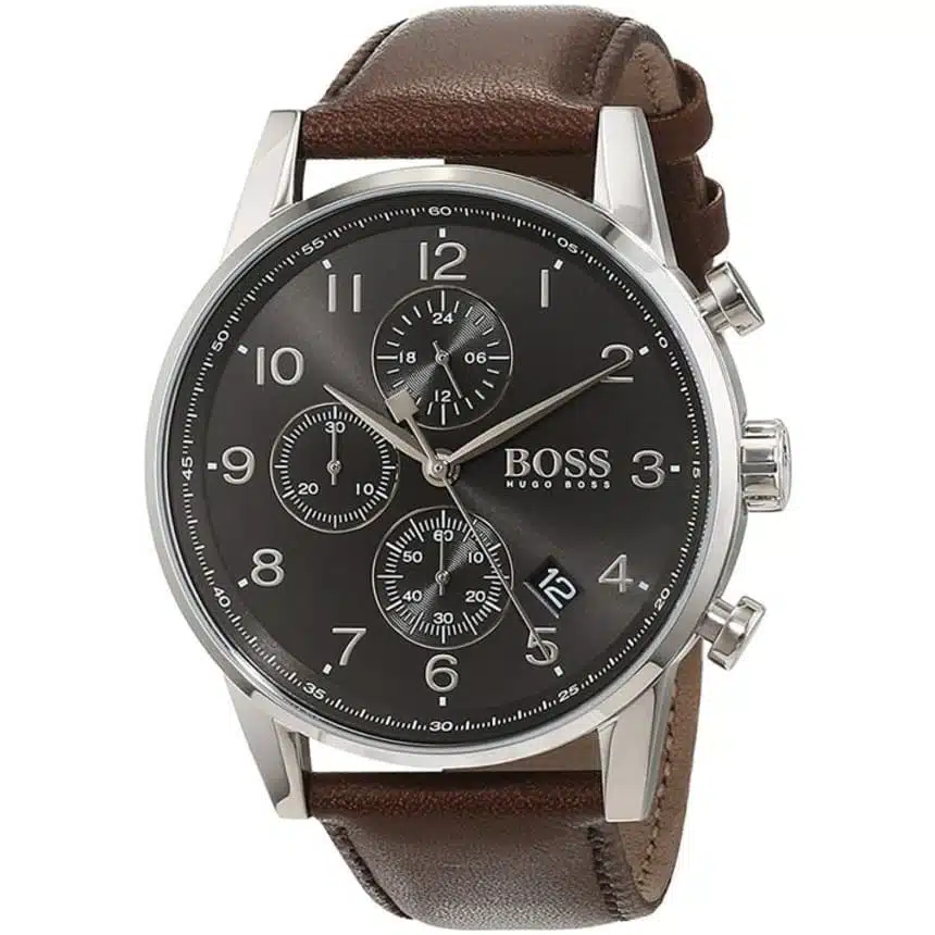 Hugo Boss Navigator Classic 1513494 är en sofistikerad herrklocka med tydlig kronograf, datumvisning och komfortabelt läderarmband i brunt – perfekt för både vardag och formella tillfällen.