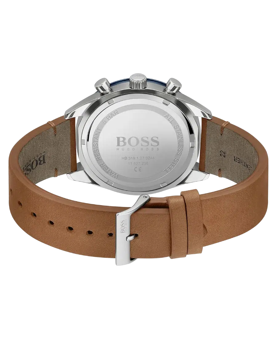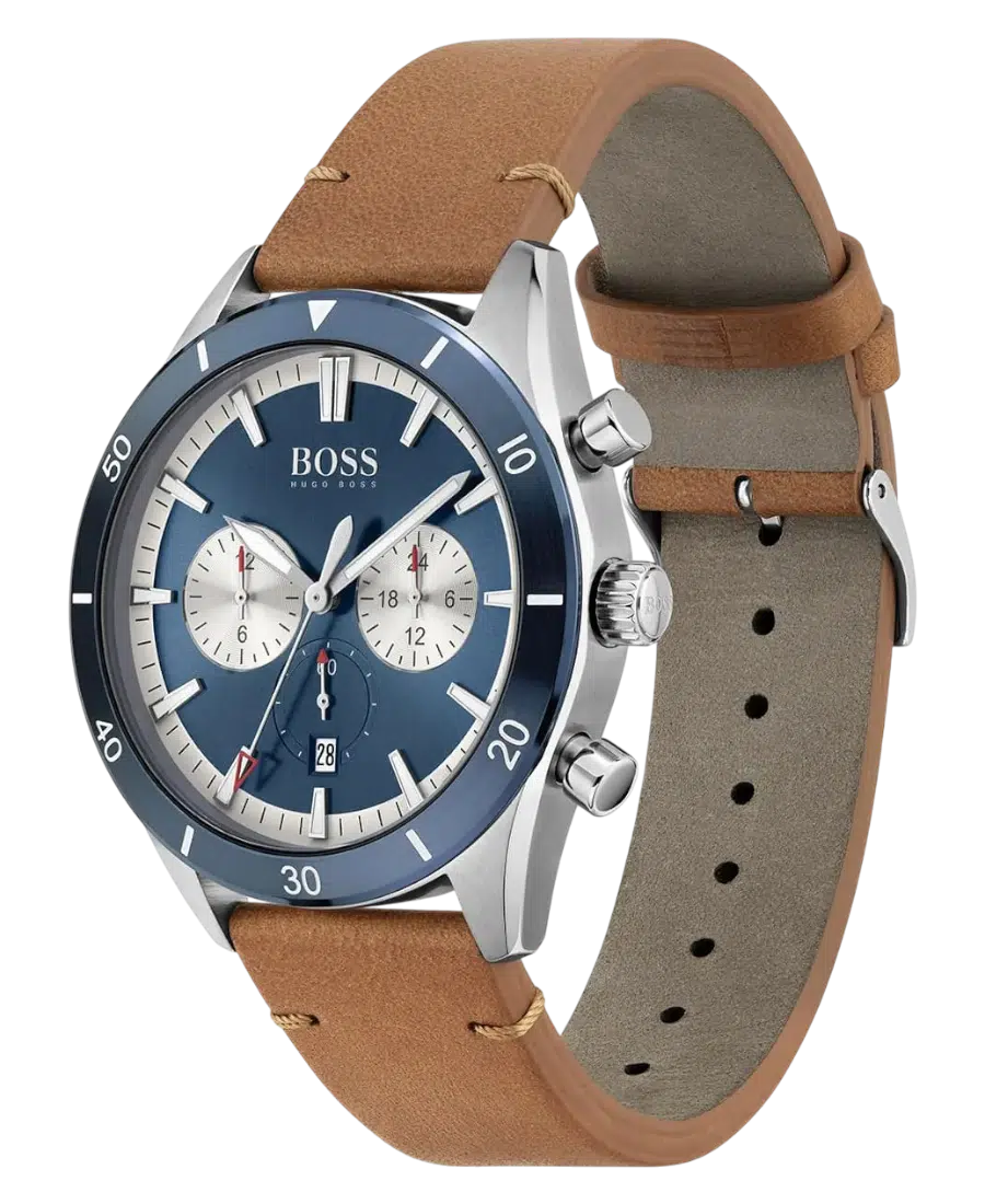 Hugo Boss herrklocka Santiago med blå urtavla, boett i rostfritt stål och brunt kalvläderarmband. 44 mm boett, kvartsurverk, datumvisning och 5 ATM vattenskydd.