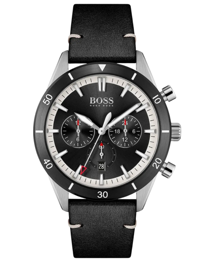 Hugo Boss Santiago 1513864 är en sportig och elegant herrklocka med svart urtavla och svart läderarmband, perfekt för både vardag och formella tillfällen.