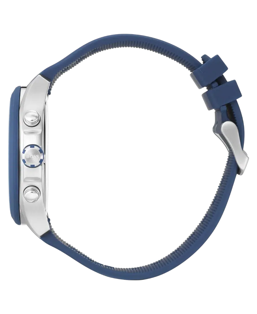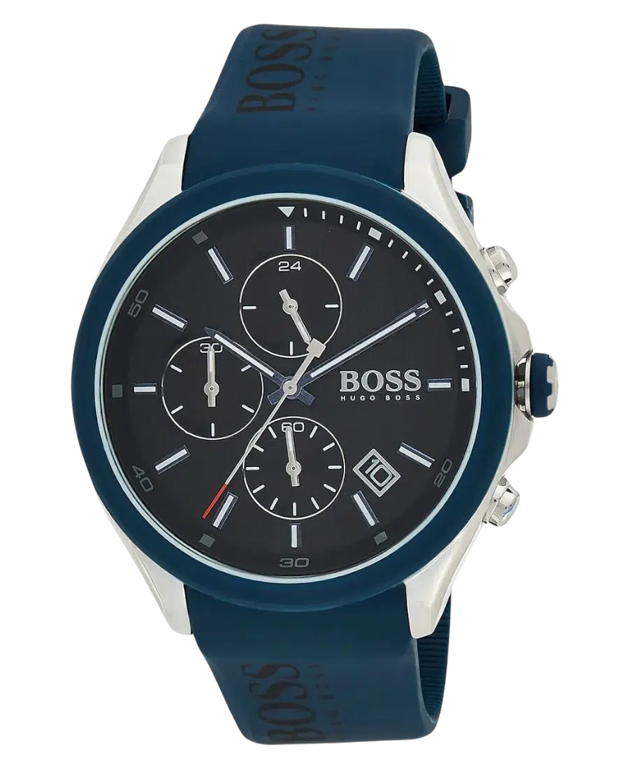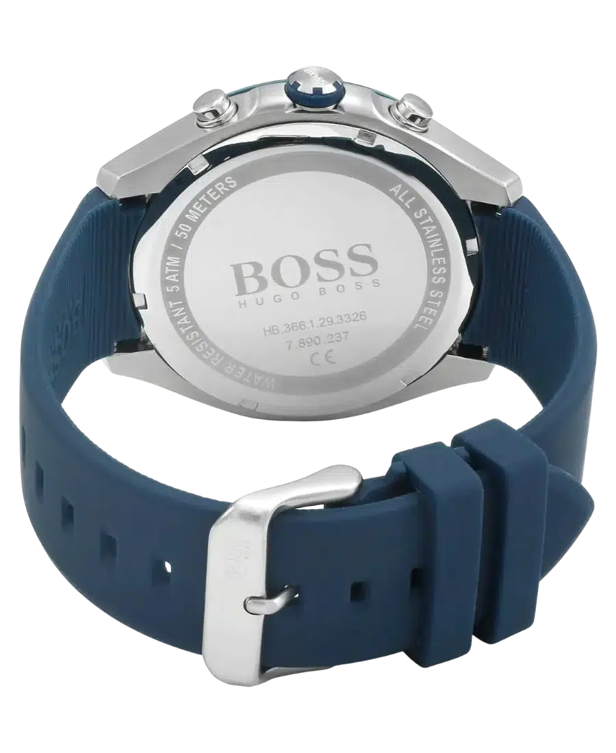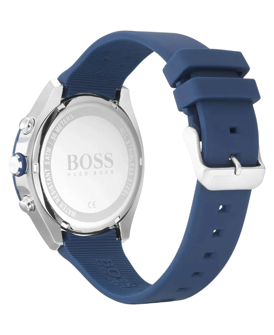 Hugo Boss herrklocka med svart urtavla, boett i rostfritt stål och svart gummiarmband. 44 mm boett, kvartsurverk, datumvisning, kronograf och 5 ATM vattenskydd.
