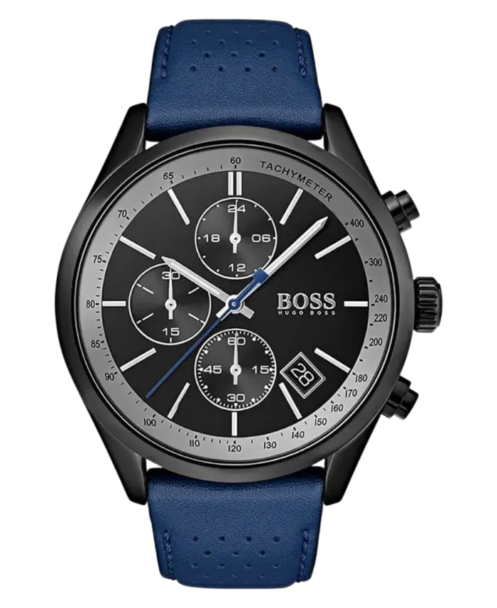 Hugo Boss herrklocka med svart urtavla, boett i rostfritt stål och blått läderarmband. 44 mm boett, kvartsurverk, datumvisning, kronograf och 3 ATM vattenskydd.
