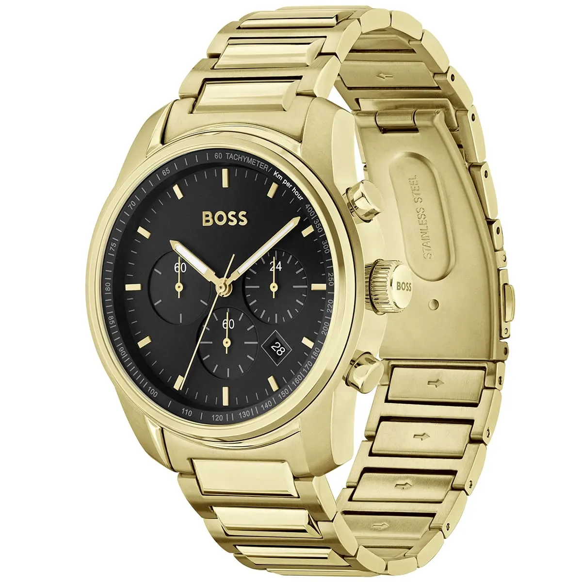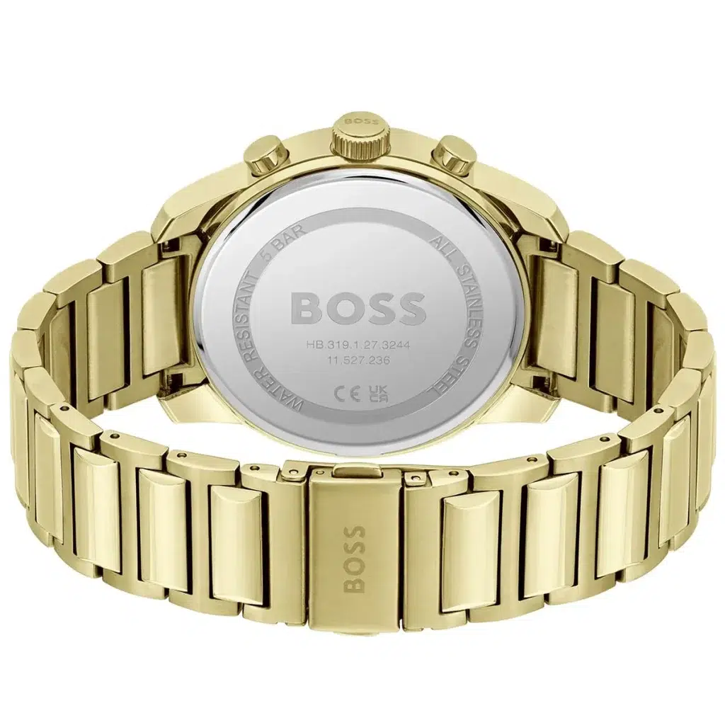 Hugo Boss Trace 1514006 är en elegant kronografklocka med svart urtavla och guldfärgat stålarmband, perfekt för både vardag och formella tillfällen.
