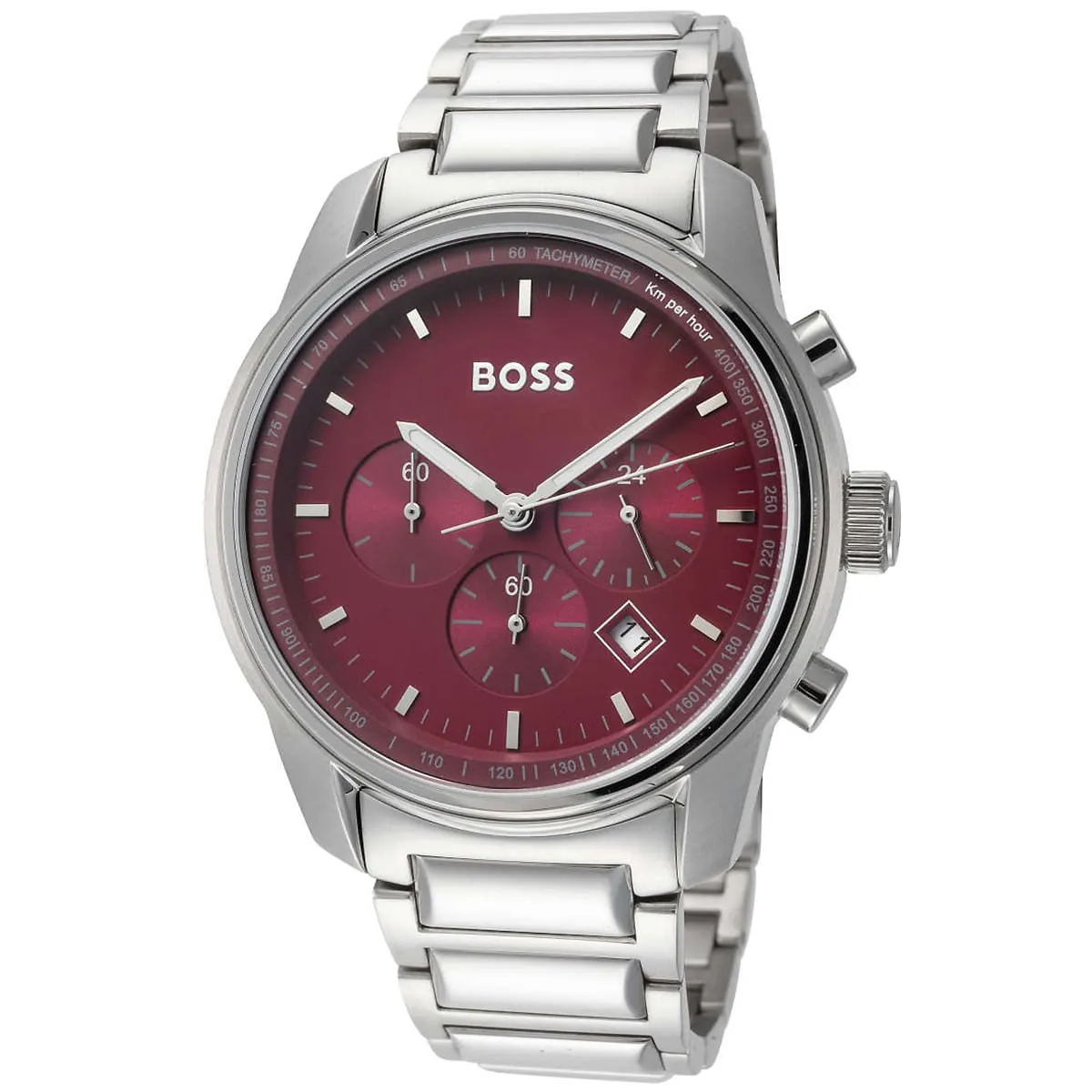 Hugo Boss 1514004 är en sportig och stilfull herrklocka med röd urtavla och silverfärgat stålarmband, utrustad med kronograffunktion och datumvisning — perfekt för både vardag och formella tillfällen.