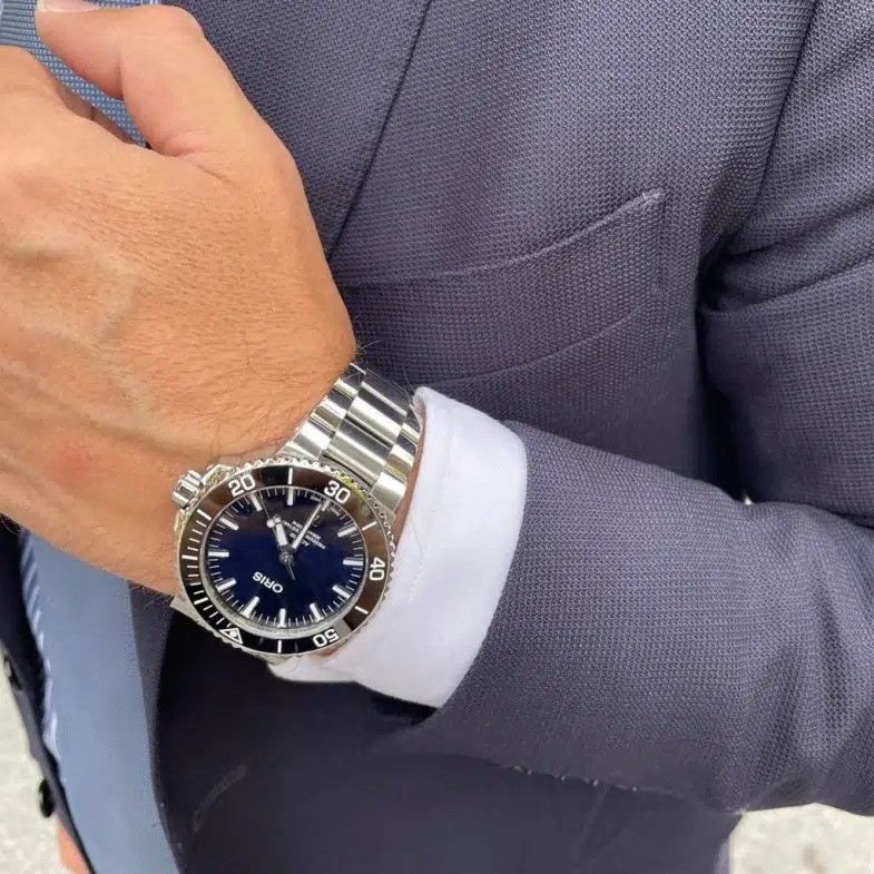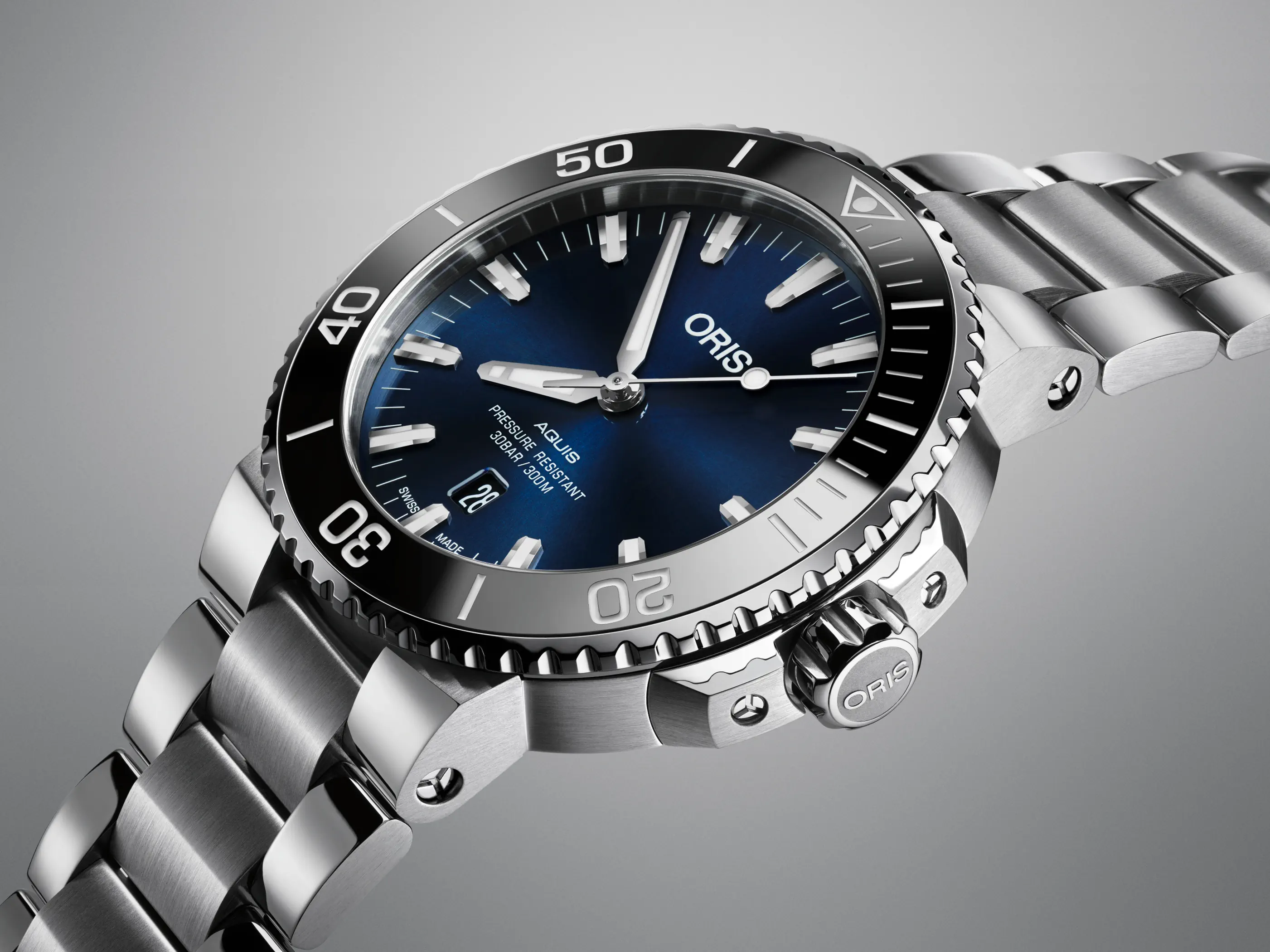Oris Aquis Date 01 733 7730 4135‑07 8 24 05PEB är en robust och mångsidig dykarur med blå urtavla och stålarmband, designad för både vardagsbruk och dykning upp till stora djup.