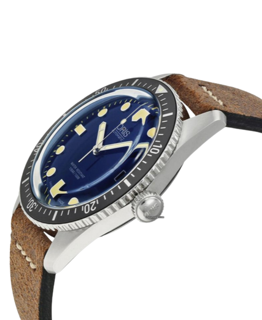 Oris Divers Sixty‑Five 01 733 7720 4055‑07 5 21 02 är en klassisk dykarklocka med blå urtavla och brunt läderband, utrustad med automatisk rörelse och datumfunktion — perfekt för dykning, sport och vardagligt bruk.