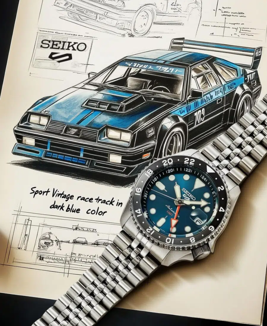 Seiko 5 Sports Automatic GMT herrklocka i blå urtavla med automatiskt urverk, 42.5 mm boett i stål, hårt mineralglas, stålarmband, 10 ATM vattenskydd och datumvisning.