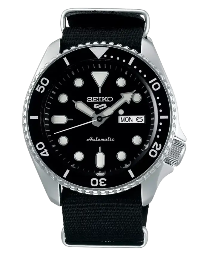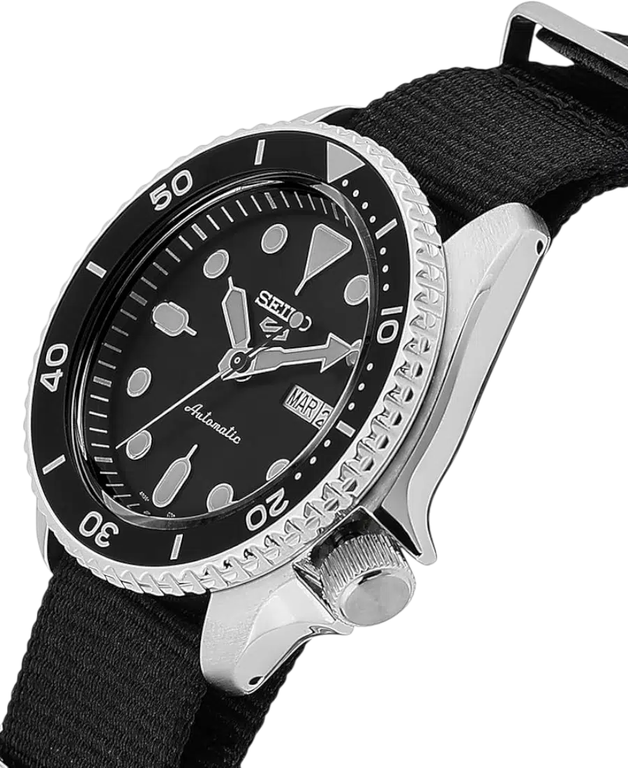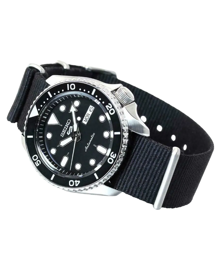 Seiko 5 Sports SRPD55K3 är en automatisk sportklocka för herrar med 43 mm boett i rostfritt stål och svart urtavla. Utrustad med Seikos pålitliga automatiska 4R36-verk med 41 timmars gångreserv. Klockan har dag- och datumvisning, Hardlex-glas, vridbar svart bezel och textilarmband. Vattenskydd 10 ATM. En robust och sportig modell inom Seiko 5-serien.