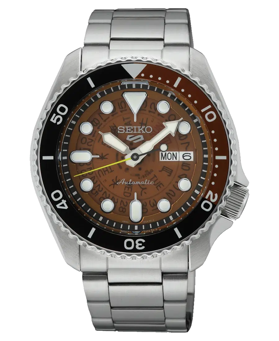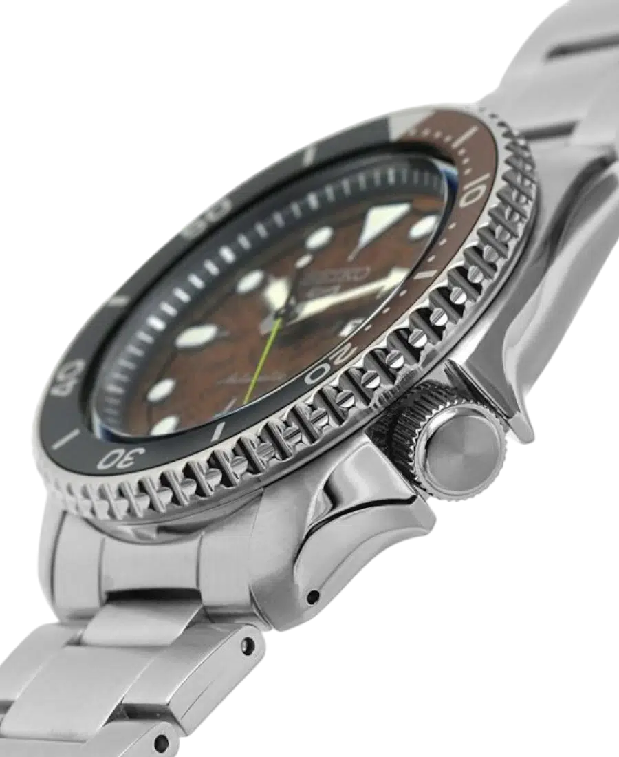 Seiko 5 Sports Automatisk Skeleton Brun/Stål 42.5 mm. Rostfritt stål boett och armband, 42.5 mm diameter, 13.4 mm tjocklek, brun urtavla med skeleton-design, Hardlex-glas, 100 m vattenskydd och dag/datum funktion.