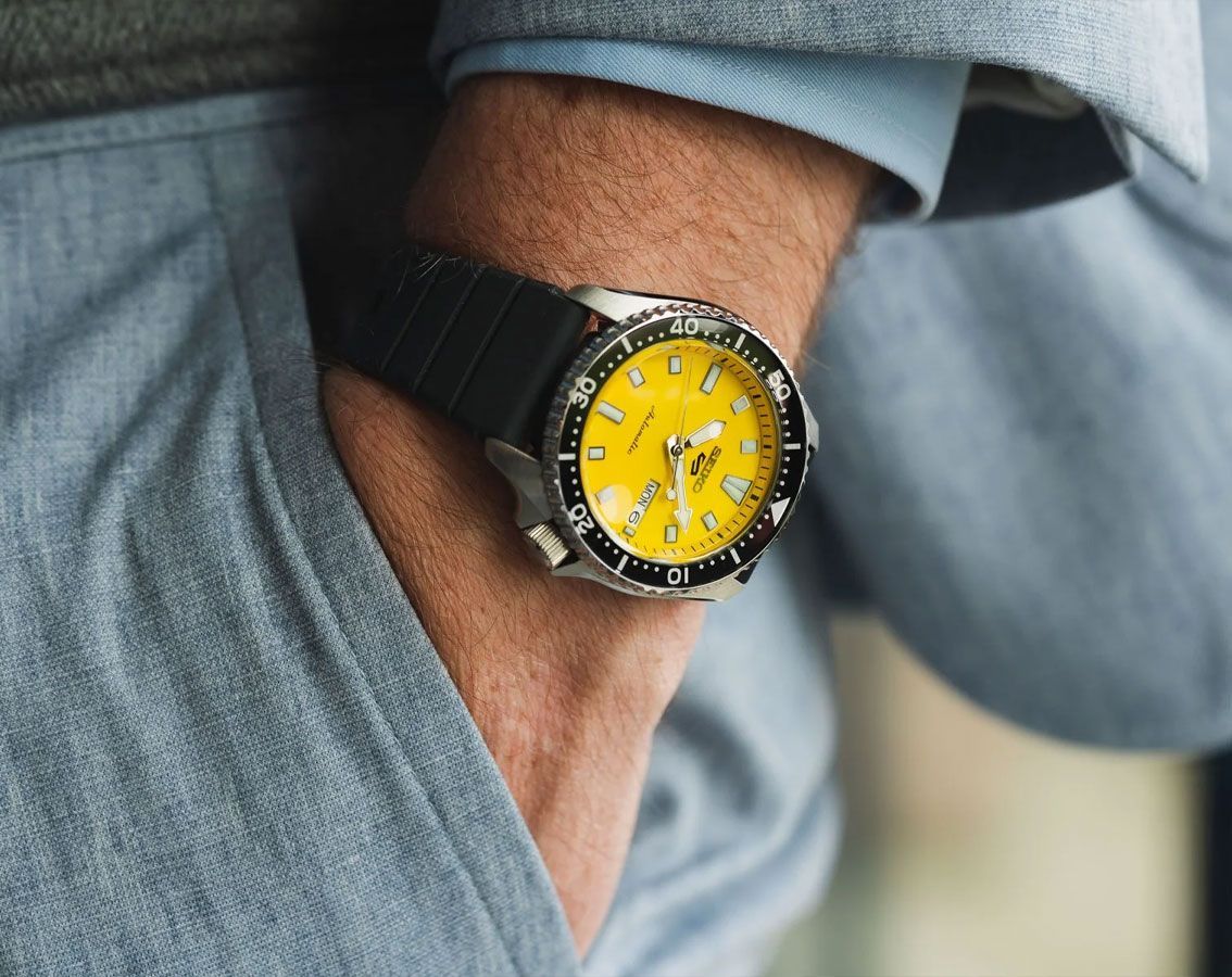 Seiko 5 Sports SRPL87 är en sportig och iögonfallande automatisk herrklocka inspirerad av den ikoniska SKX-designen. Den kraftfulla gula urtavlan tillsammans med svart silikonarmband ger ett modernt och djärvt uttryck som passar perfekt för både vardag och sportiga aktiviteter.