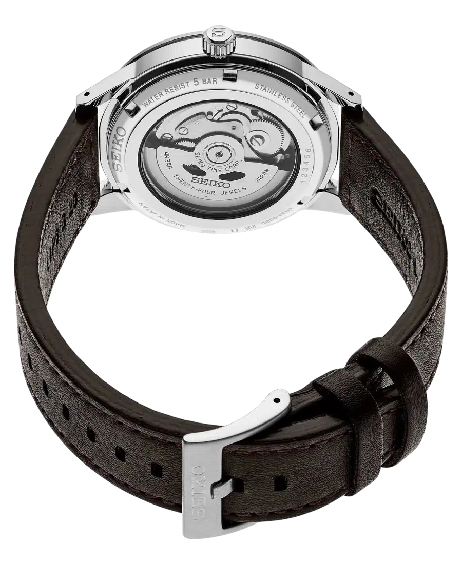 SEIKO Presage Automatisk Brun/Läder 40.8 mm — SEIKO Presage Automatisk Herrklocka — Brun urtavla och Brun armband — 5 ATM (50 meter) — Glas: Repskyddat safirglas — Boett: Borstat/polerat rostfritt stål