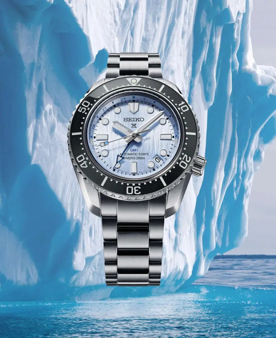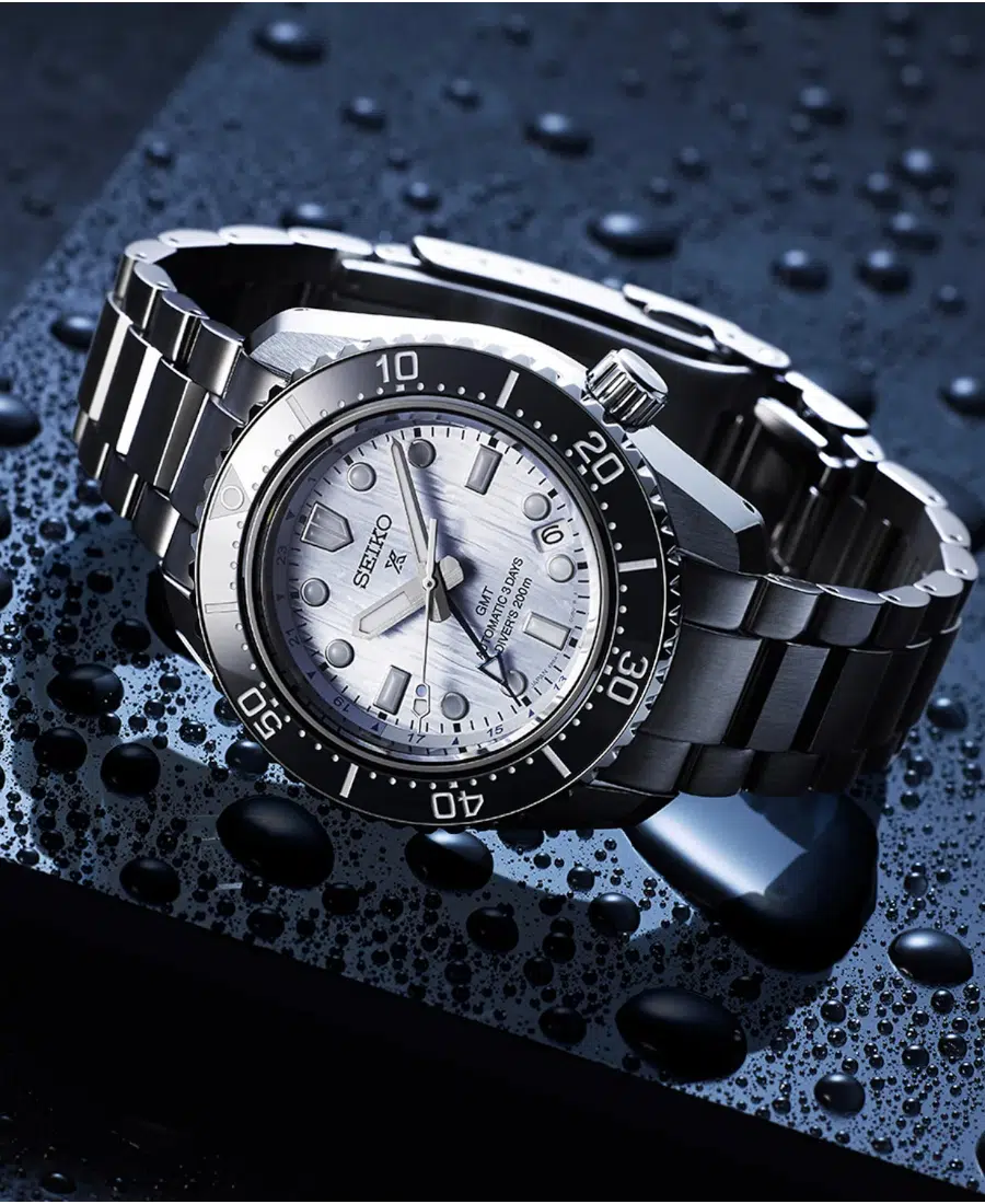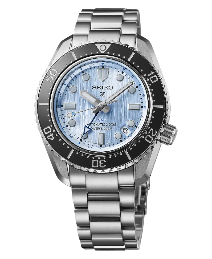 Seiko Prospex Automatic Diver Save The Ocean Limited Edition herrklocka i blå urtavla med automatiskt urverk, 42 mm boett i stål, safirglas, stålarmband, 20 ATM vattenskydd, GMT-funktion och datumvisning.