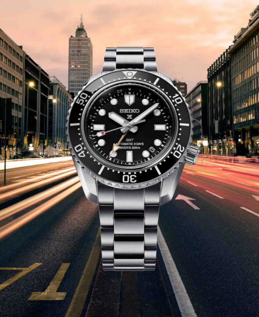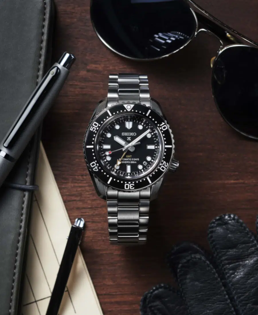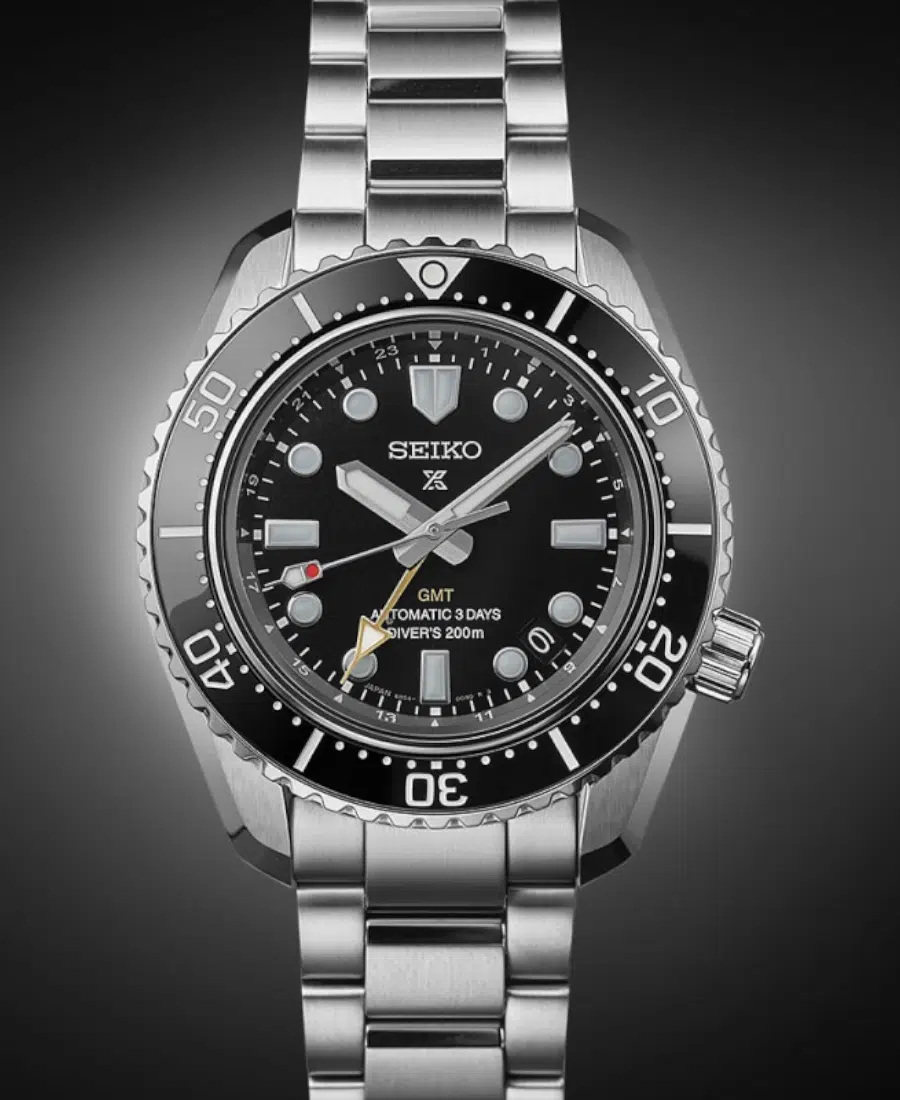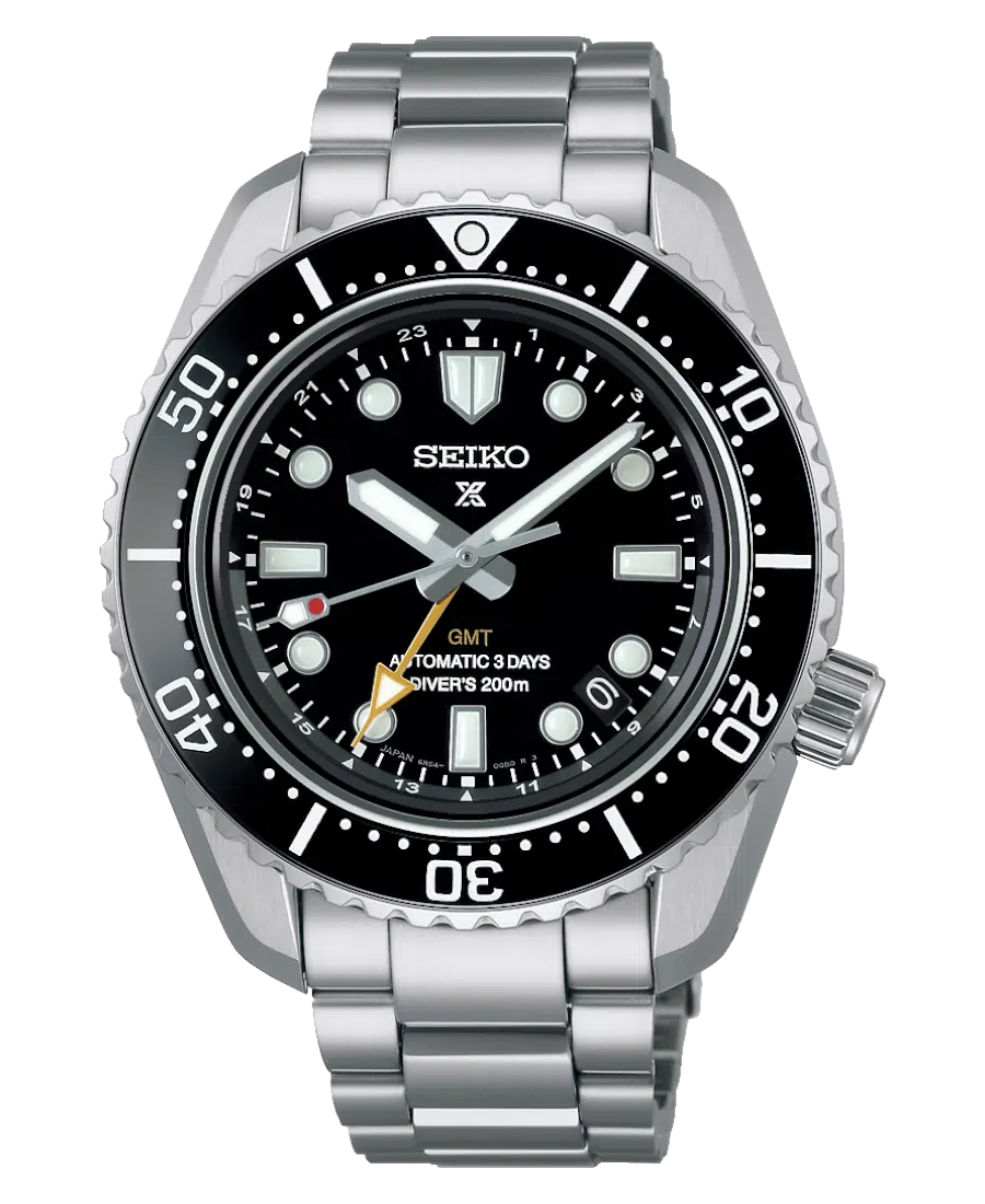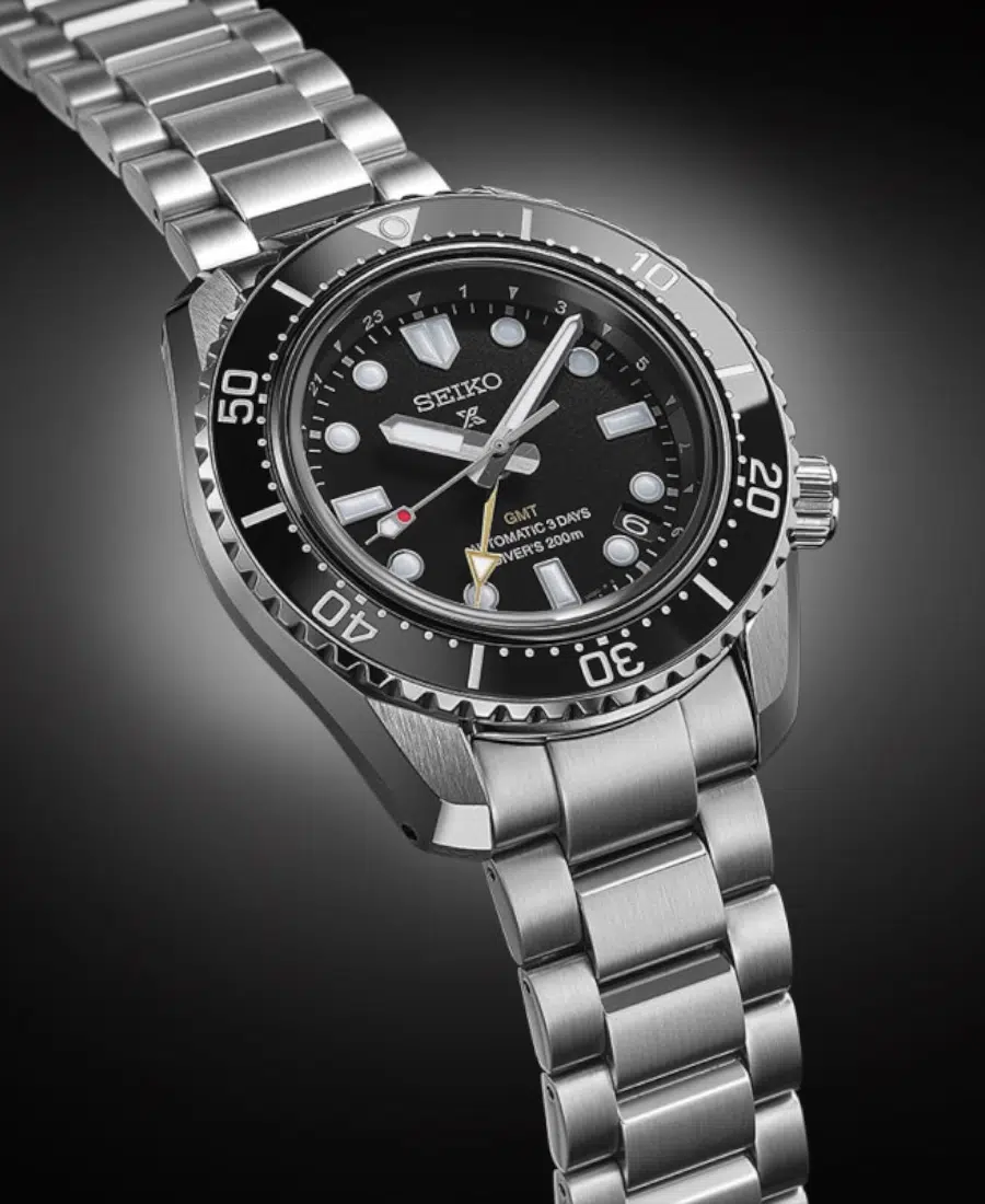 Seiko Prospex Automatic GMT Diver herrklocka i svart urtavla med automatiskt urverk, 42 mm boett i stål, safirglas, stålarmband, 20 ATM vattenskydd, GMT-funktion och datumvisning.