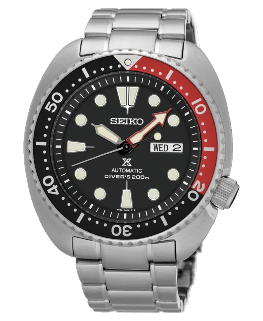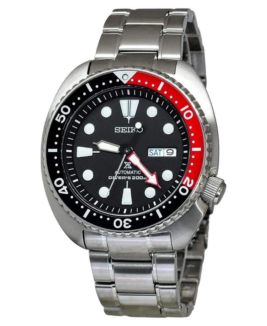 Seiko Prospex Automatisk Turtle Svart/Röd 45 mm. Rostfritt stål boett och armband, 45 mm diameter, 13.4 mm tjocklek, svart urtavla med dag/datum, Hardlex-glas, 200 m vattenskydd och vridbar bezel i svart/rött.
