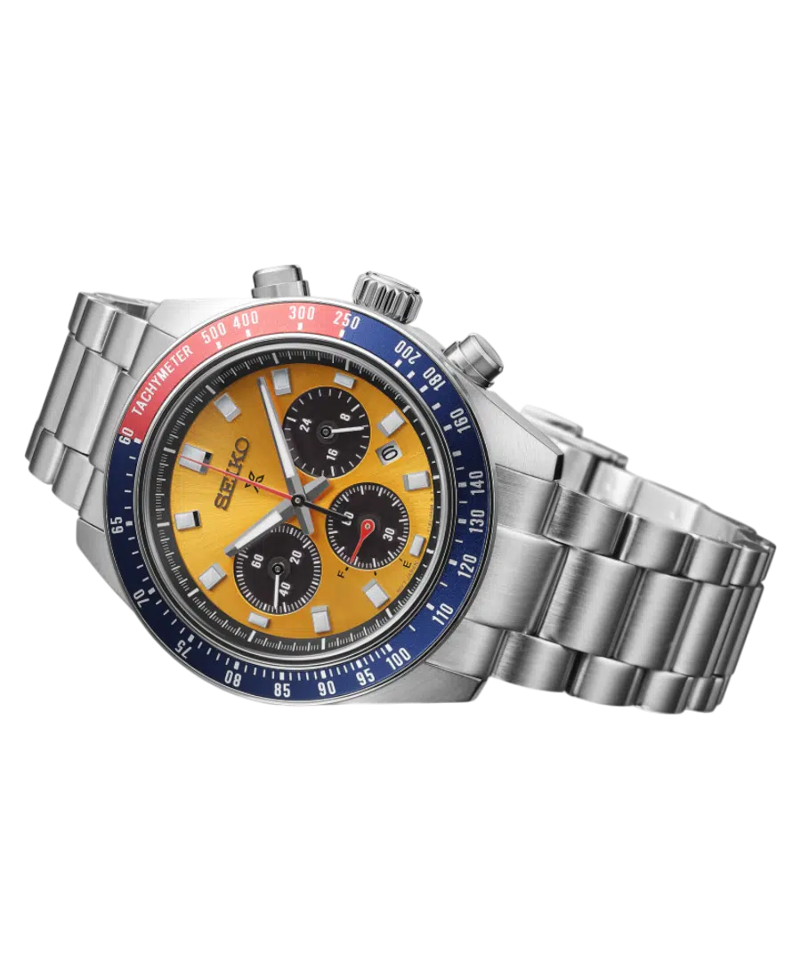 Seiko Prospex Speedtimer herrklocka i orange med soldrivet kvartsur, 41.4 mm boett i stål, safirglas, stålarmband, 10 ATM vattenskydd och kronograf.