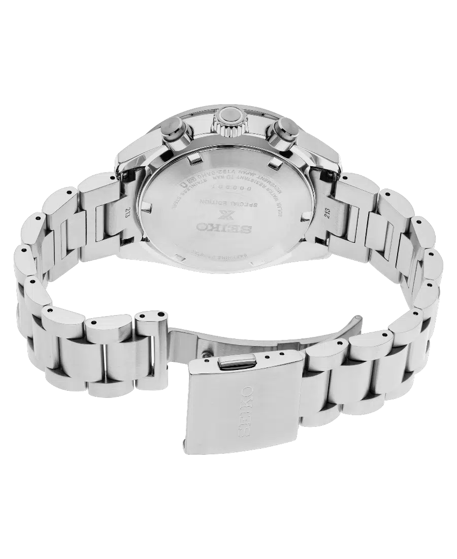 Seiko Prospex Speedtimer herrklocka i gul urtavla med soldrivet kvartsur, 41.4 mm boett i stål, safirglas, stålarmband, 10 ATM vattenskydd och kronograf.